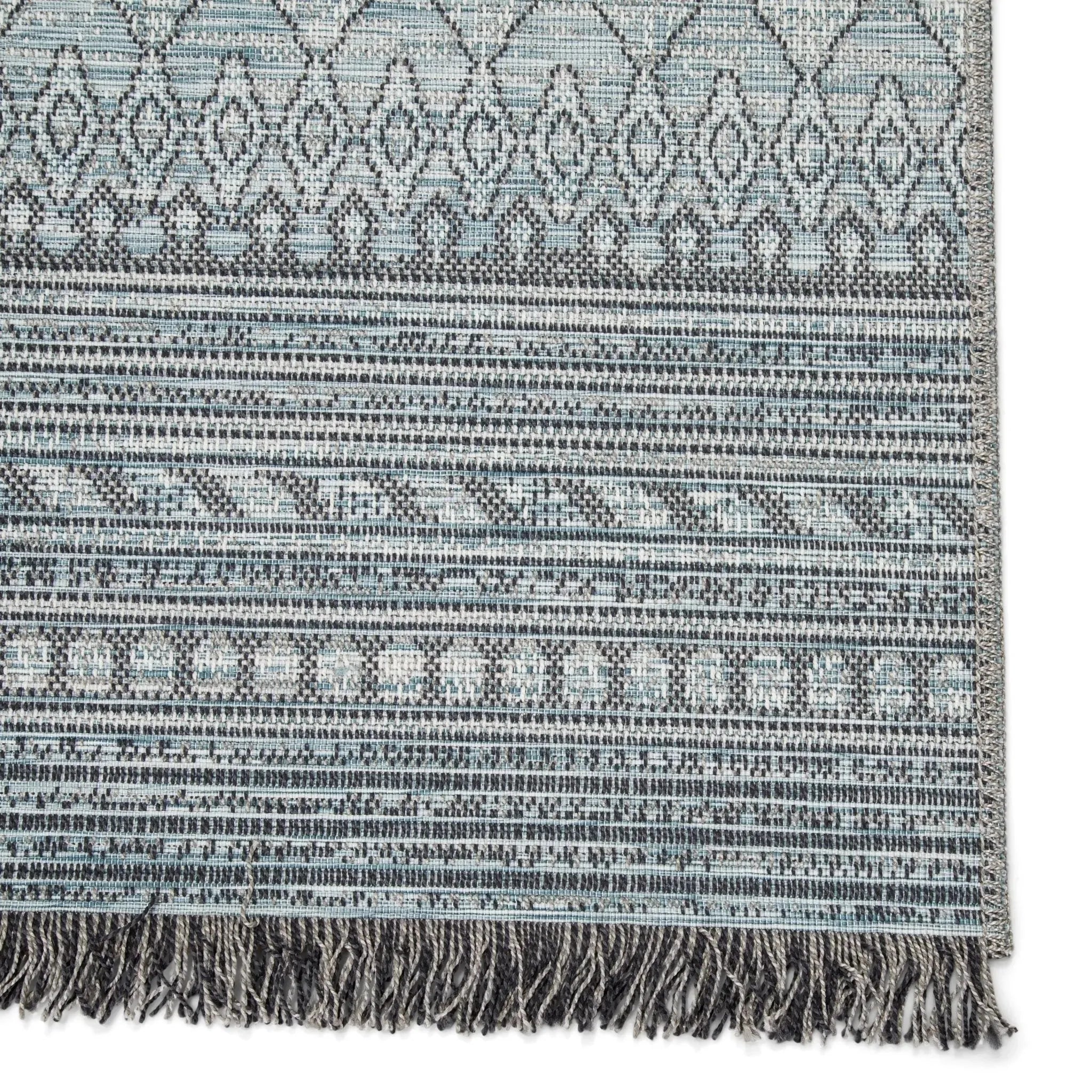 With an assortment of relaxed, bohemian designs, the Tikal collection is the perfect weather-resistant and stylish accent for outdoor and indoor settings. The flat-woven Ravi rug features a pattern-rich tribal border that frames a heathered center and chic fringe for added texture. The gray and light blue colorway offers a versatile decorating palette to any space.