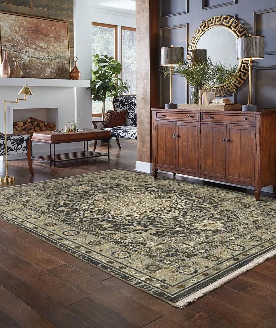 This collection is glamorous but still grounded by a carefully curated combination of both traditional and transitional patterns. Rising to the occasion, the designs satisfy a craving for contrast, with a fashion forward fusion of matte and sheen finishes. Wonderfully woven the styles of this collection feature a superb texture with the innovative fiber blend of matte wool and subtly shimmering viscose. Strands of viscose yarn strategically interwoven into the wool construction capture light and elegantly glisten, giving the rugs a rich dimension and soft metallic luster. Inspired by the exquisite and rare beauty of 19th-century antique Serapi carpets, the Regency area rug in charcoal is a modern version of this coveted connoisseurs classic. Notes of metallic yarn add an air of luxury to the traditional Persian motif. Beautifully designed with Karastan Rugs' Van de Wiele woven construction, the Regency features rich texture with its innovative blend of matte wool and viscose sheen. A debut of Karastan Rugs' Titanium collection, the Regency is available in charcoal.