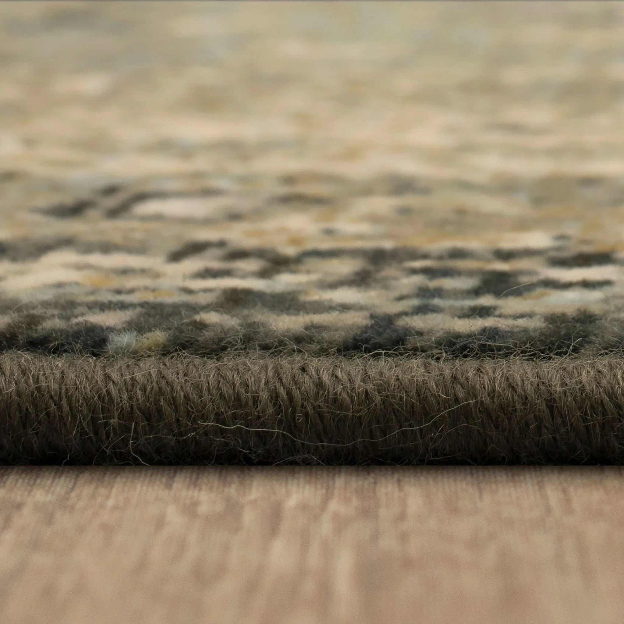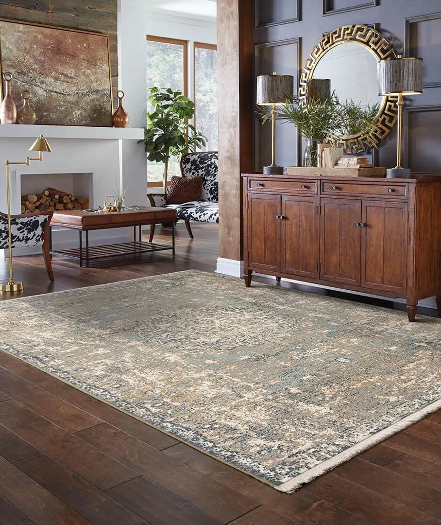 This collection is glamorous but still grounded by a carefully curated combination of both traditional and transitional patterns. Rising to the occasion, the designs satisfy a craving for contrast, with a fashion forward fusion of matte and sheen finishes. Wonderfully woven the styles of this collection feature a superb texture with the innovative fiber blend of matte wool and subtly shimmering viscose. Strands of viscose yarn strategically interwoven into the wool construction capture light and elegantly glisten, giving the rugs a rich dimension and soft metallic luster. Designed in collaboration with the antique inspired artisans of Patina Vie, the Floret area rug in Seagrass features an ornate central medallion with details appearing as delicate as antique lace. Framed in similar fashion, the Floret showcases a lavish quartz inspired base with hints of pale mint green, ivory, silver, grey and aqua blue. Wonderfully woven with Karastan Rugs' renowned Van De Wiele looms, the styles of this collection feature a matchless texture with the innovative fiber blend of matte wool and subtly shimmering viscose. Strands of viscose yarn strategically interwoven into the wool construction capture light and elegantly glisten, giving the rugs of the Titanium Collection a rich dimension and soft metallic luster.