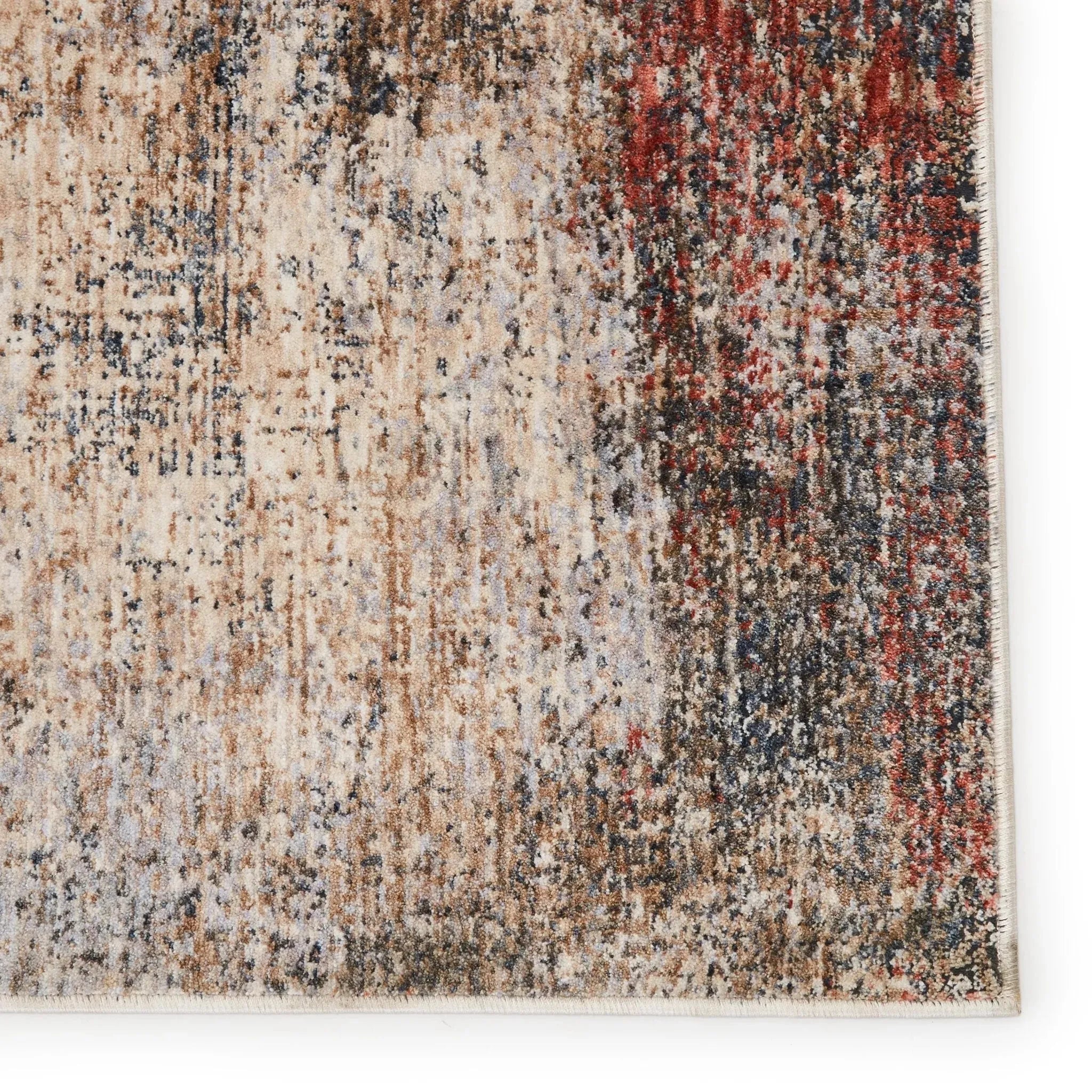 The richly colored Vanaday collection lends stunningly distressed designs to on-trend spaces. The Kyson rug features an open abstract design with a space-dyed colorway of dusty red, deep blue, cream, tan, and gray. Easy-to-clean and perfect for heavily trafficked areas, this polyester rug combines an innovative power-loomed quality with a vintage-inspired, global look.