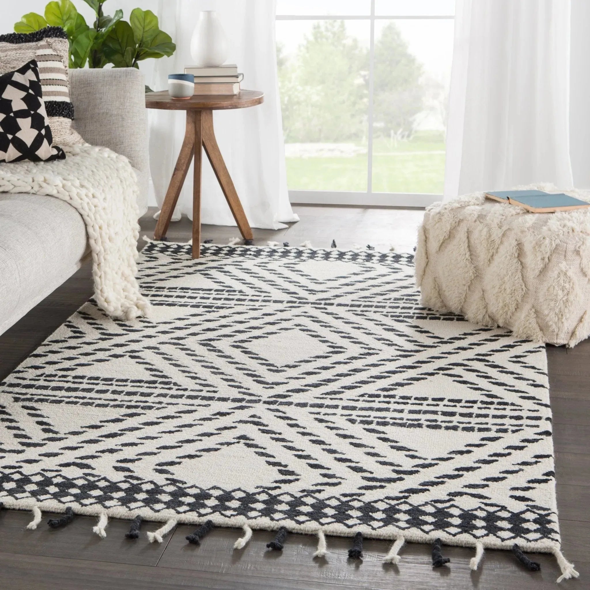 Hand tufted of wool, the Vera collection by Nikki Chu infuses contemporary spaces with inspiring patterns and versatile colorways. A fusion of geometric modernity and tribal motifs, the Roka rug features a black and ivory colorway for bold contrast and striking visual texture. Long, braided tassels add boho-chic charm to this worldly rug. This rug is perfect for your living room, dining room, den, bedroom, or any living space