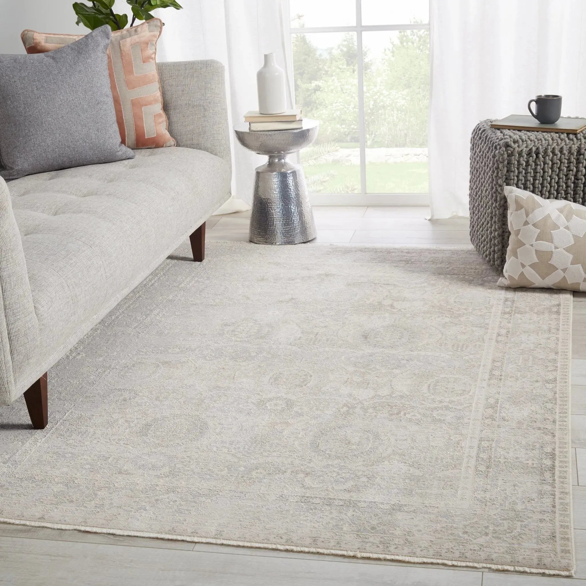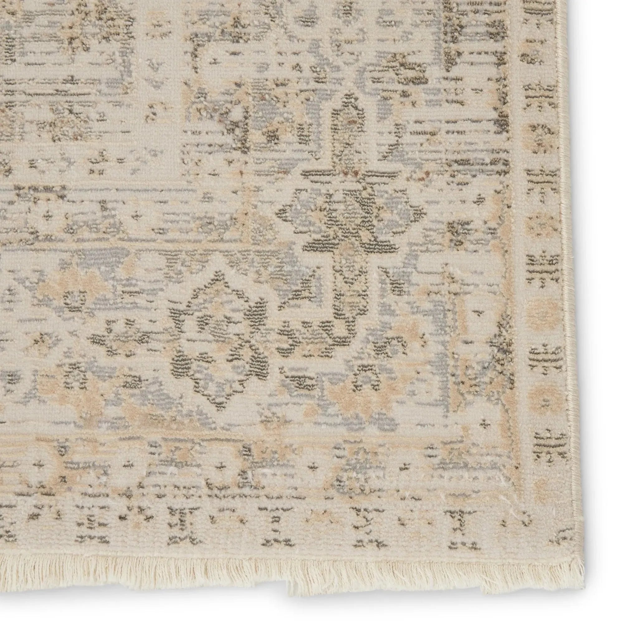 The elegant Vienne collection showcases the on-trend blanc de blanc look for an effortless and luxuriously vintage statement. The Michon rug boasts a subtly distressed brocade medallion motif in light tones of gray, cream, and ivory, with accents of metallic silver and bronze. Soft and lustrous, this chameleon-like design emulates the timeless style of a Turkish hand-knotted rug, but in an accessible polyester and viscose power-loomed quality.