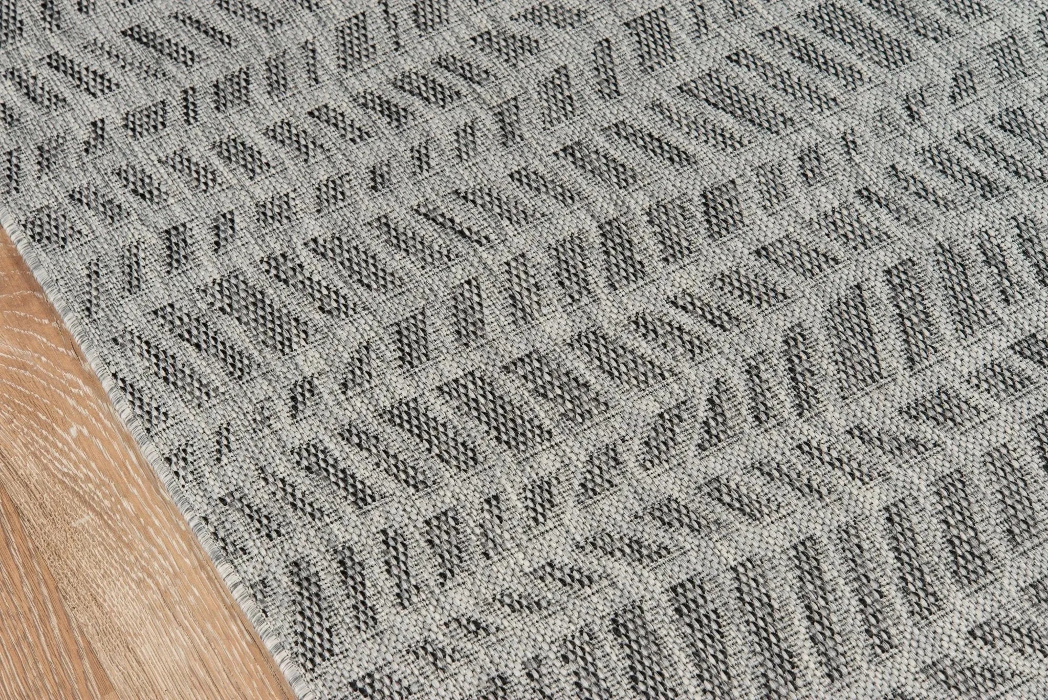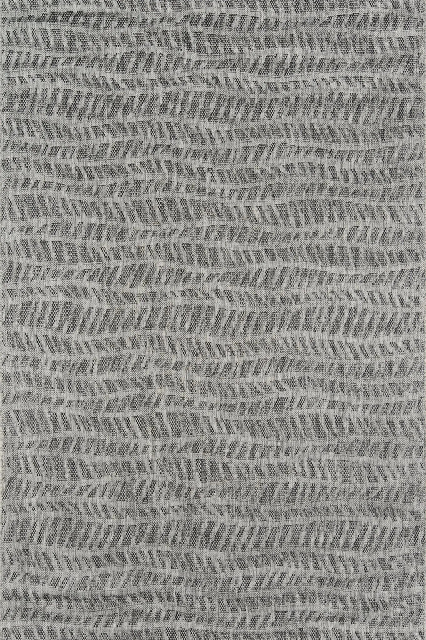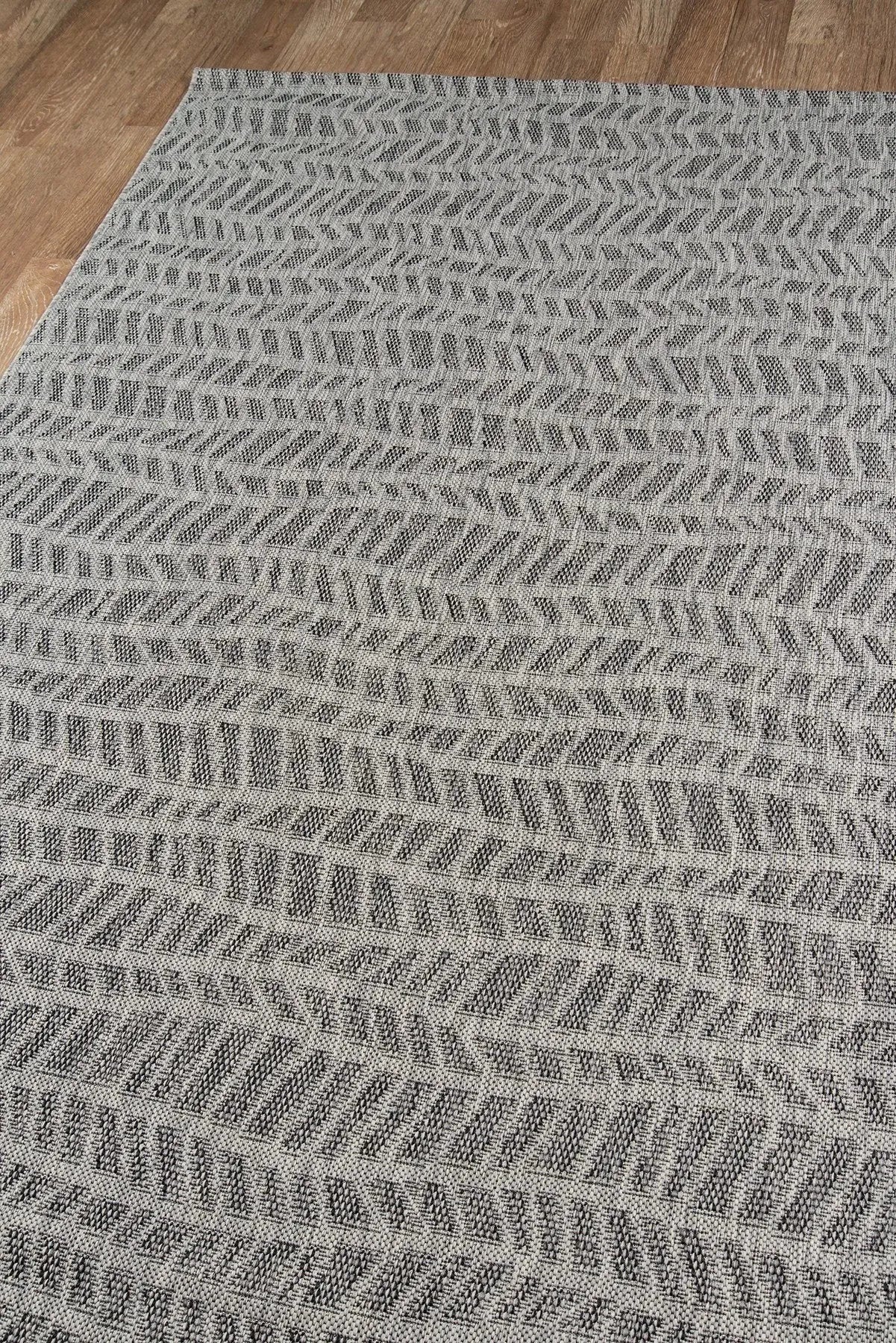 Tropical textures give the geometric pattern of this indoor/outdoor area rug a hint of tribal style. An exotic addition for sunroom, patio or pool deck floors, the rectangular rug features a series of undulating waves and divergent diagonal lines in neutral tones of grey, black and off-white. Resilient polypropylene fibers are stain, heat and UV-resistant, retaining their color and texture throughout consistent exposure to the elements.