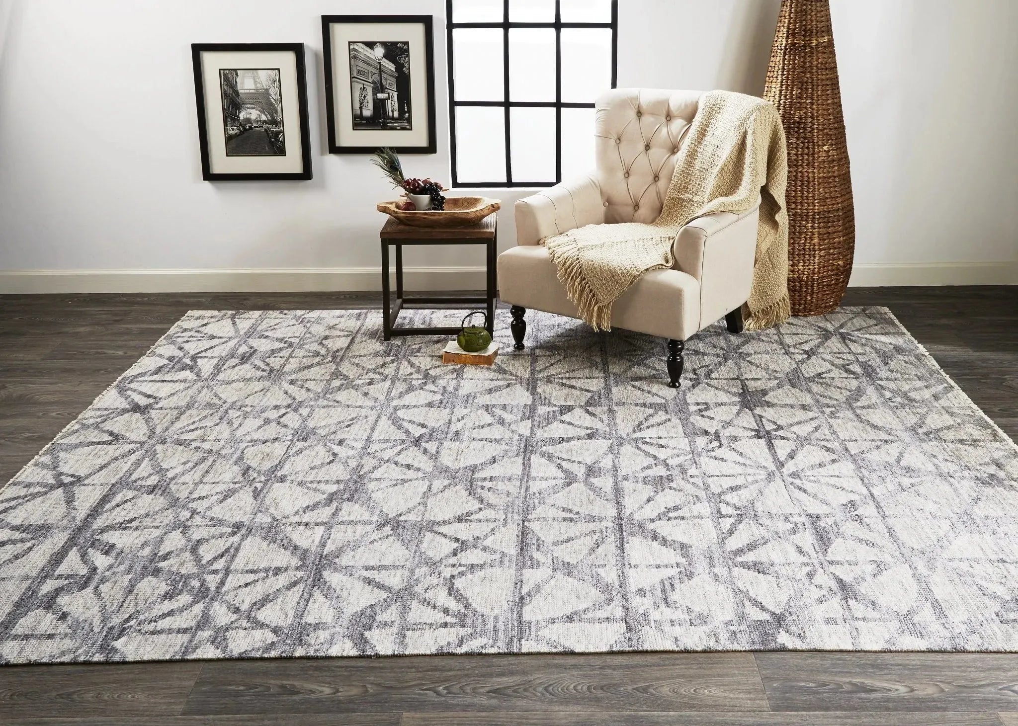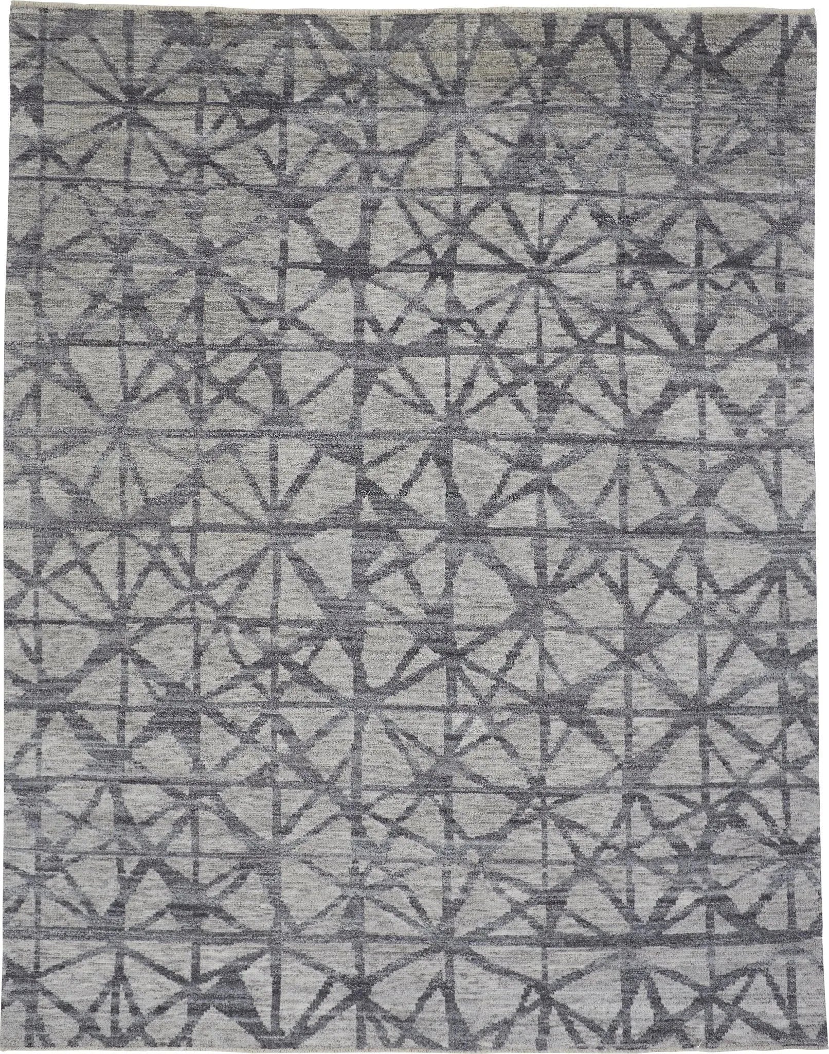 Hand knotted in a premium wool pile the dramatic Vivien Collection features graphic prints in approachable inky charcoals and earthy grays. The tone-on-tone monochromatic color palette is easy-to-decorate with as bold motifs instantly create a striking centerpiece for farmhouse eclectic and transitional home decor styles.