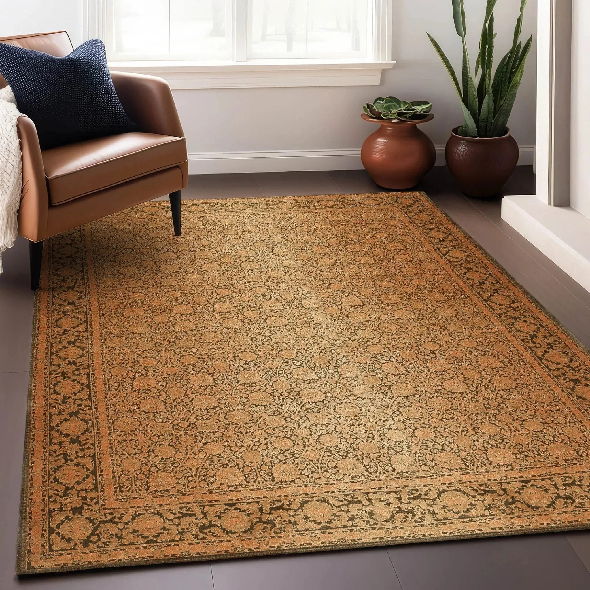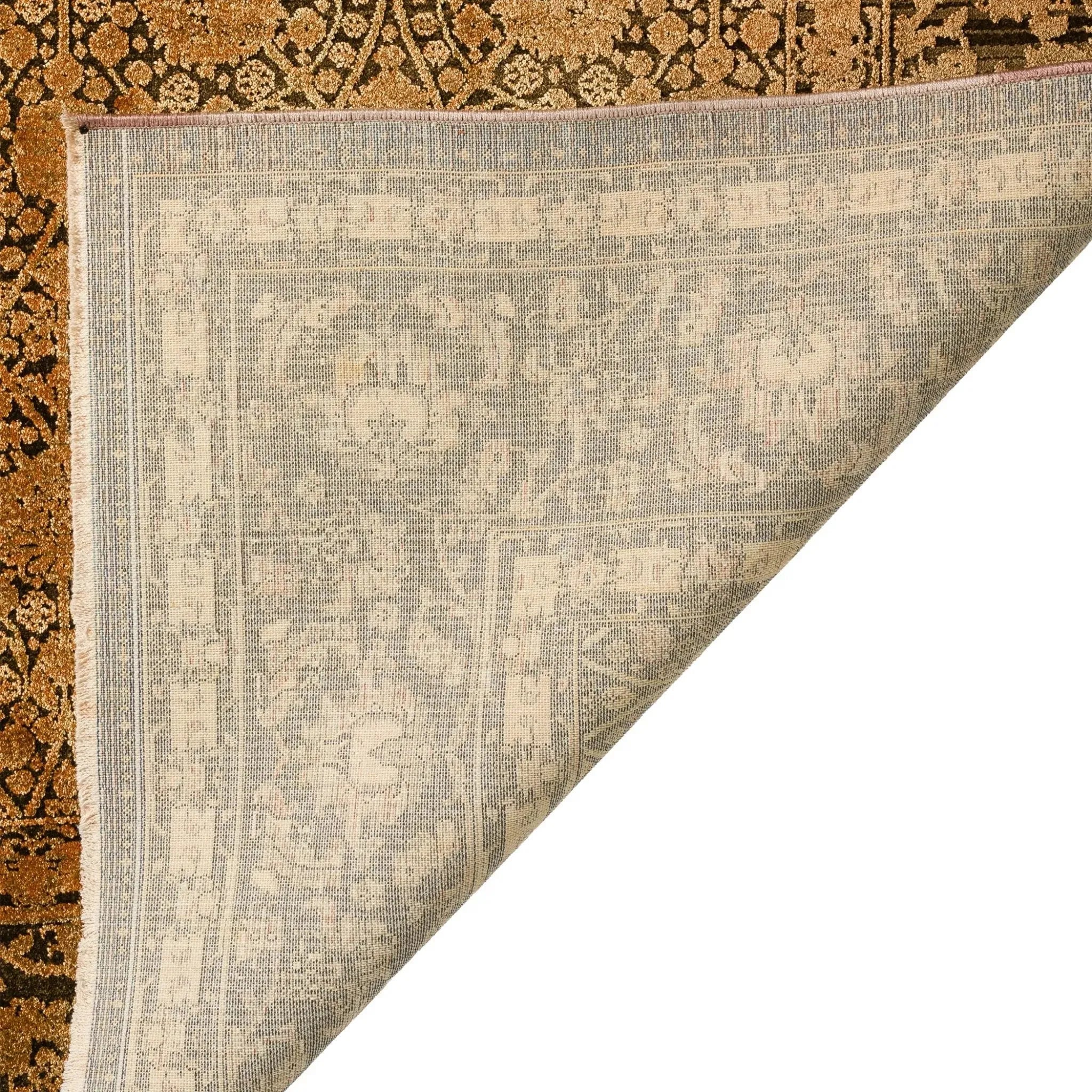 The rug showcases an exceptional Persian floral design with curvaceous leaves, bright blossoms, and other classic botanical motifs, bringing vivid energy to your living space.