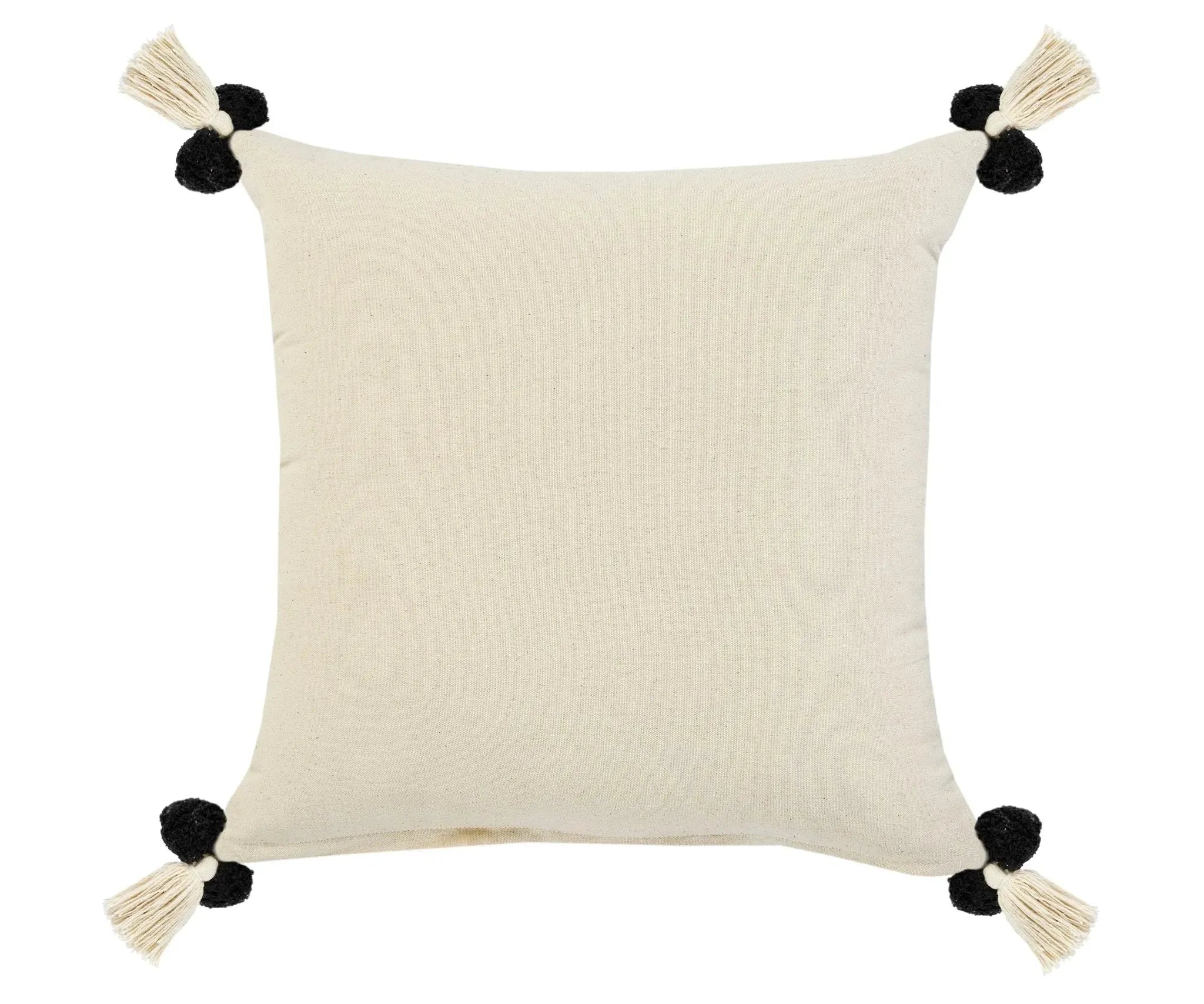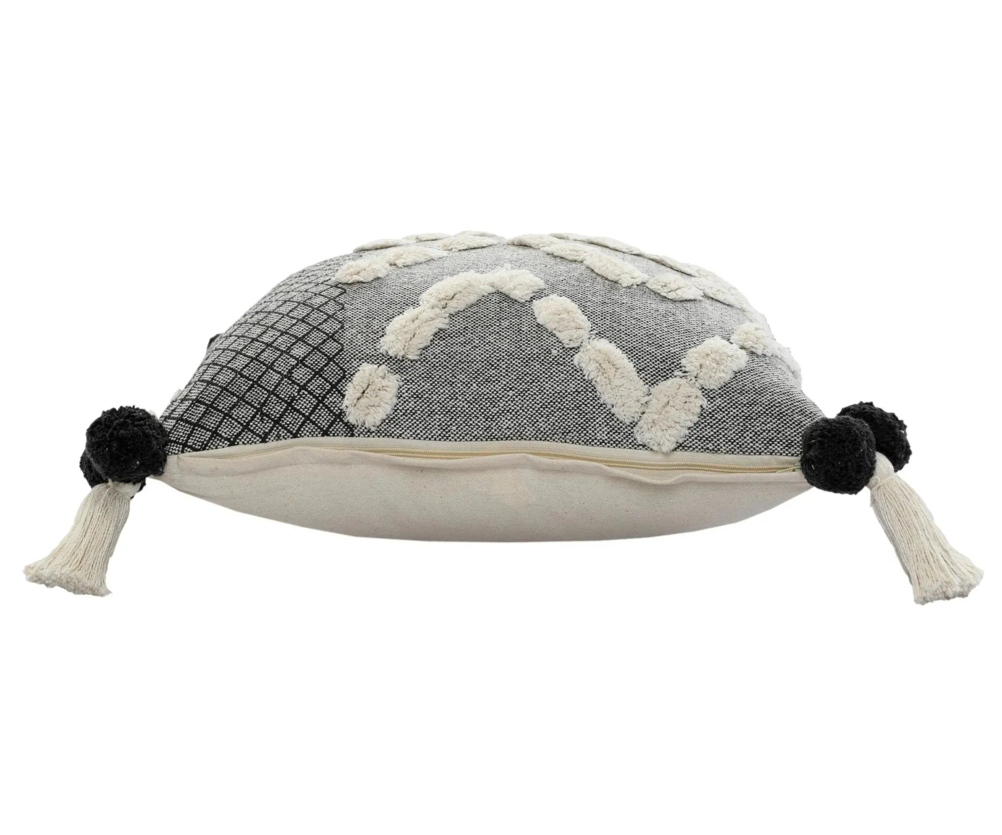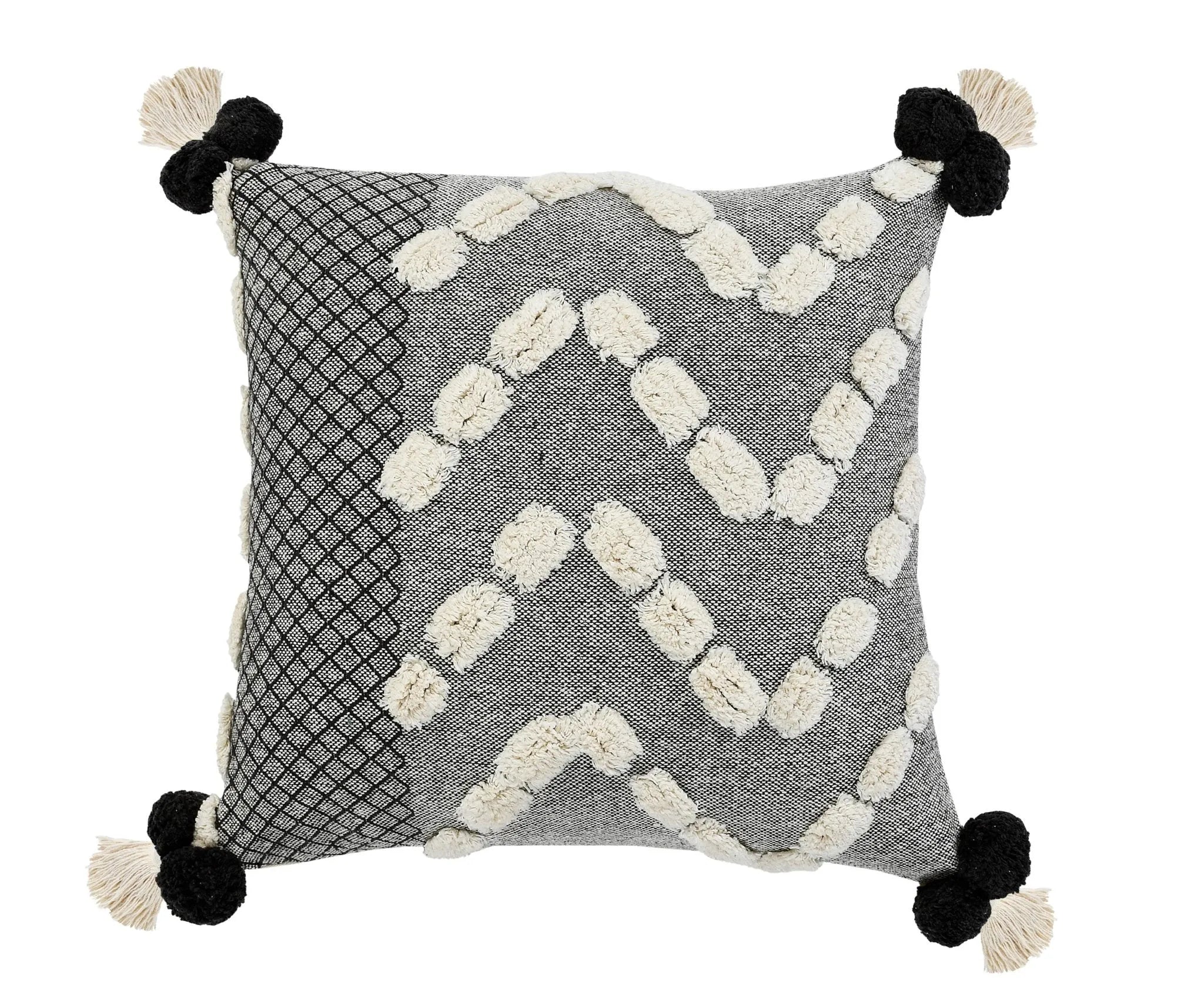 Replenish your soul in nostalgic joy with our Zeal Collection! This collection offers soft, plush textures with playful bohemian vibes. This addition features dark-hued cross-stitching, funky zig-zag over tufting and corner pom-poms tassels. This accent pillow displays complementary hues of black, gray, and cream that enhance vibrancy without overwhelming your space. Place this accent in a bedroom, kid's area, or entryway for eye-catching style and endless compliments. Handcrafted with the customer in mind, there is no compromise of comfort and style with the pillow line we create.