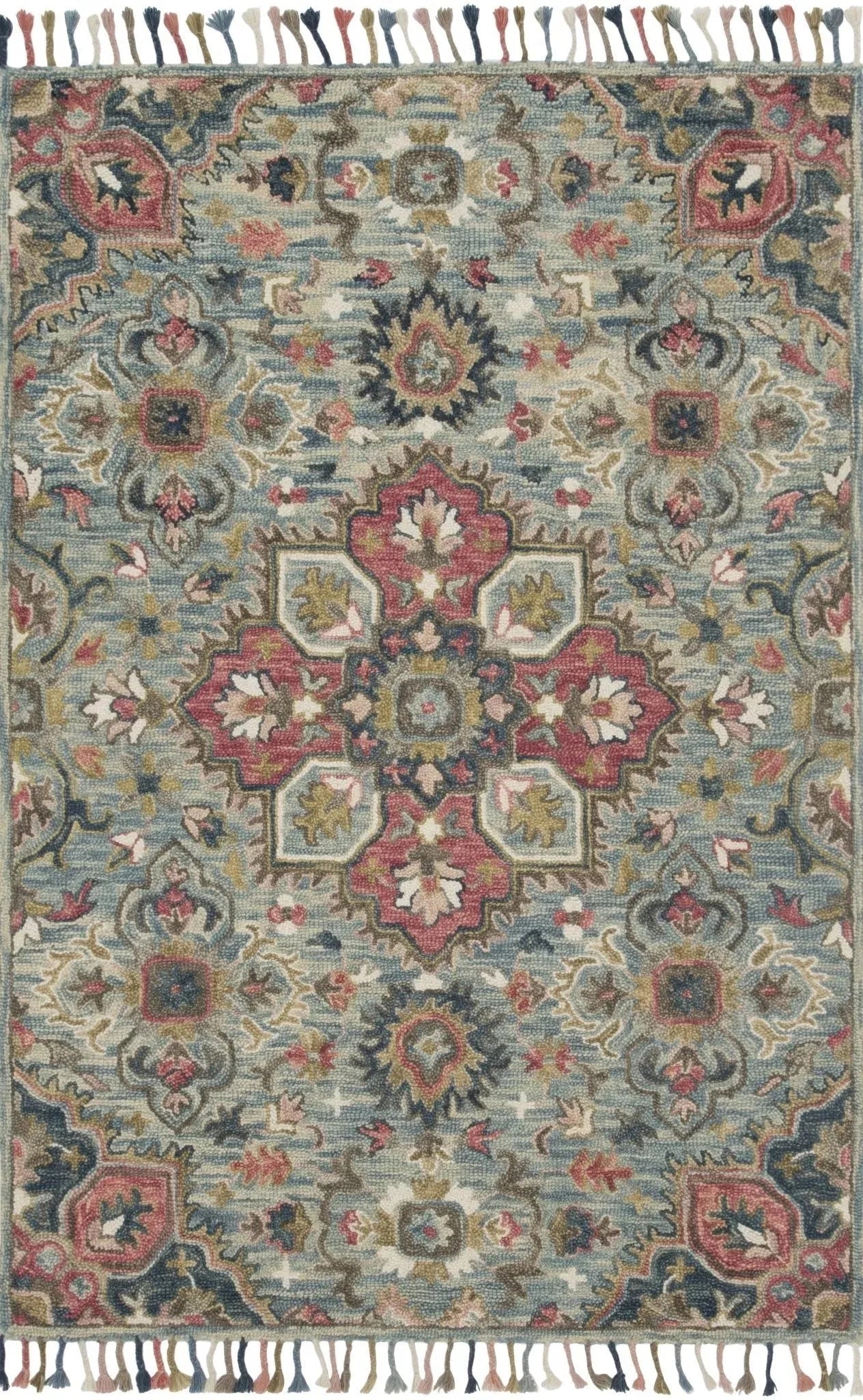 The Parisa PSA06 Denim/Multi Rug comes in various sizes, including 2x10, 5x7, 8x10, 8x11, 9x13, and 12x15 feet, accommodating different room dimensions.