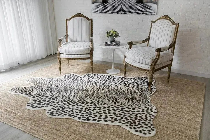 The safari style of this decorative area rug collection is artfully crafted with humane design in mind. An innovative pairing of acrylic and polyester fibers create the course impression of hair-on-hide, giving each animal print rug the look of leather with a totally touchable texture. Available in zebra, cheetah, and cow print, suede backing adds a supple finish to the underside of this decorative floorcovering, exhibiting exquisite attention to detail that̢åÛåªs cosmopolitan, yet compassionate and cruelty free.