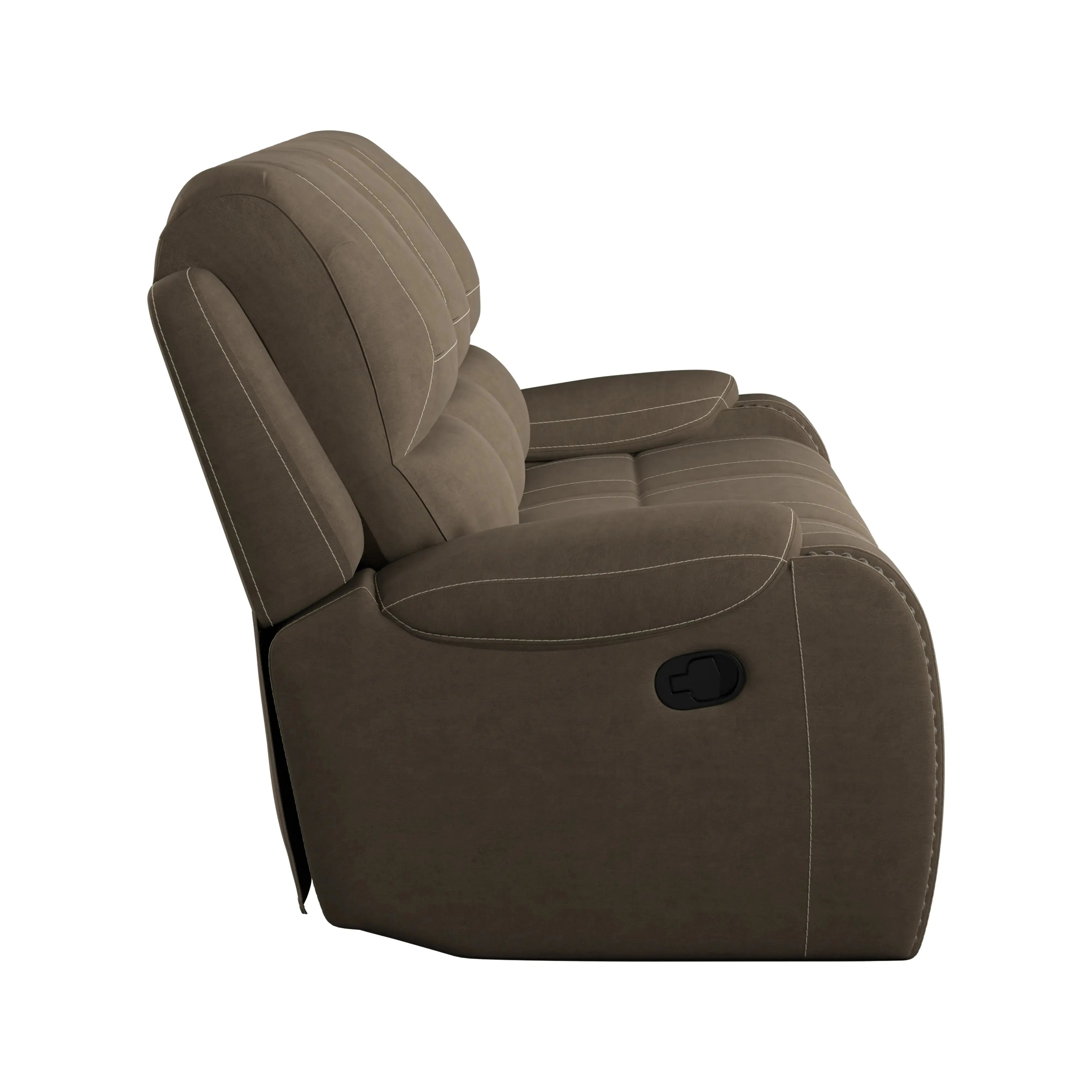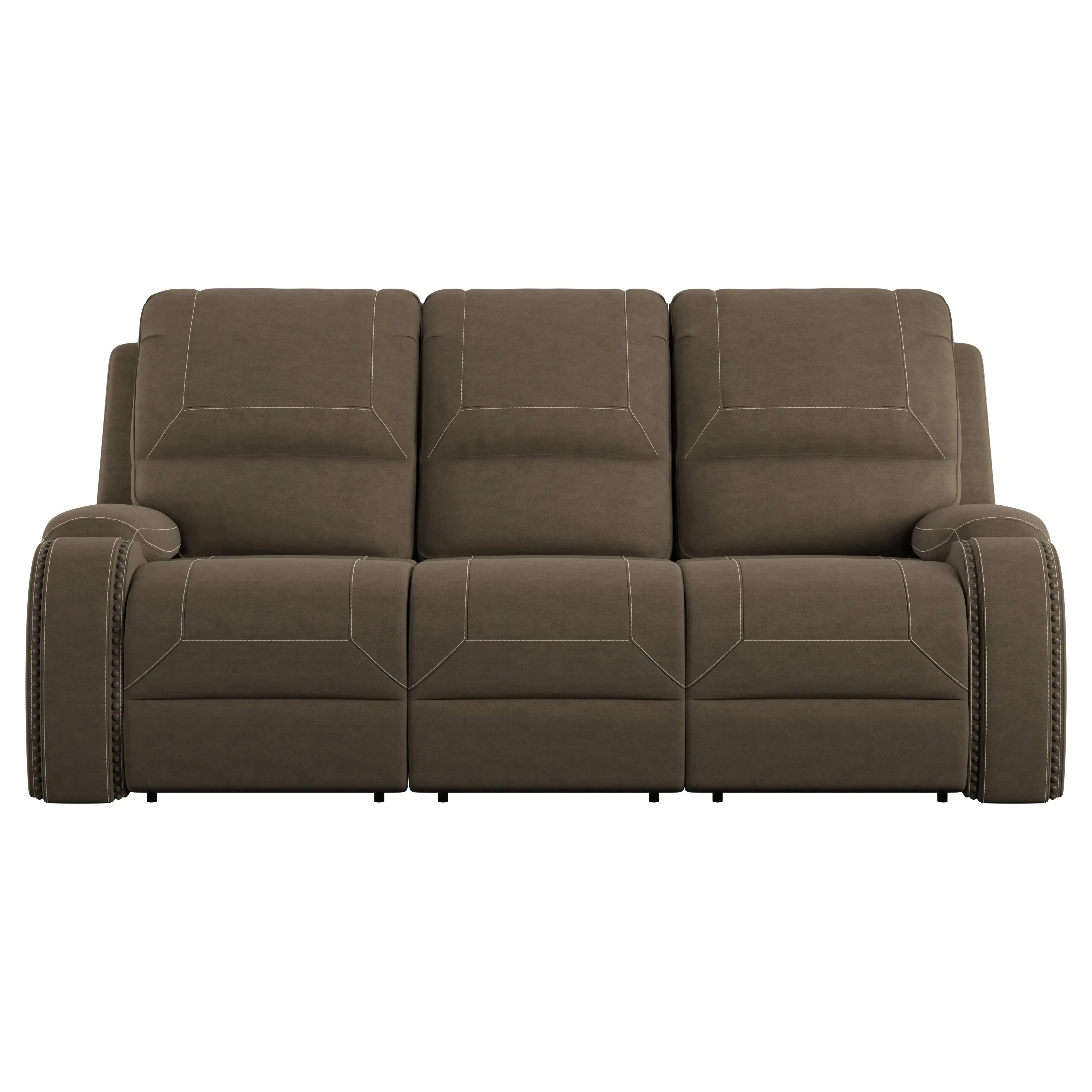 Bring casual comfort into your home with the Adrian motion collection. Soft, walnut brown upholstery is accentuated with contrast stitching, decoratively mitered seams, and copper nail head trim. The thickly pillowed back cushions and padded arms just beg you to recline into their embrace with the easy release of a lever while cupholders and USB charging ports assure you won't need to leave any time soon.