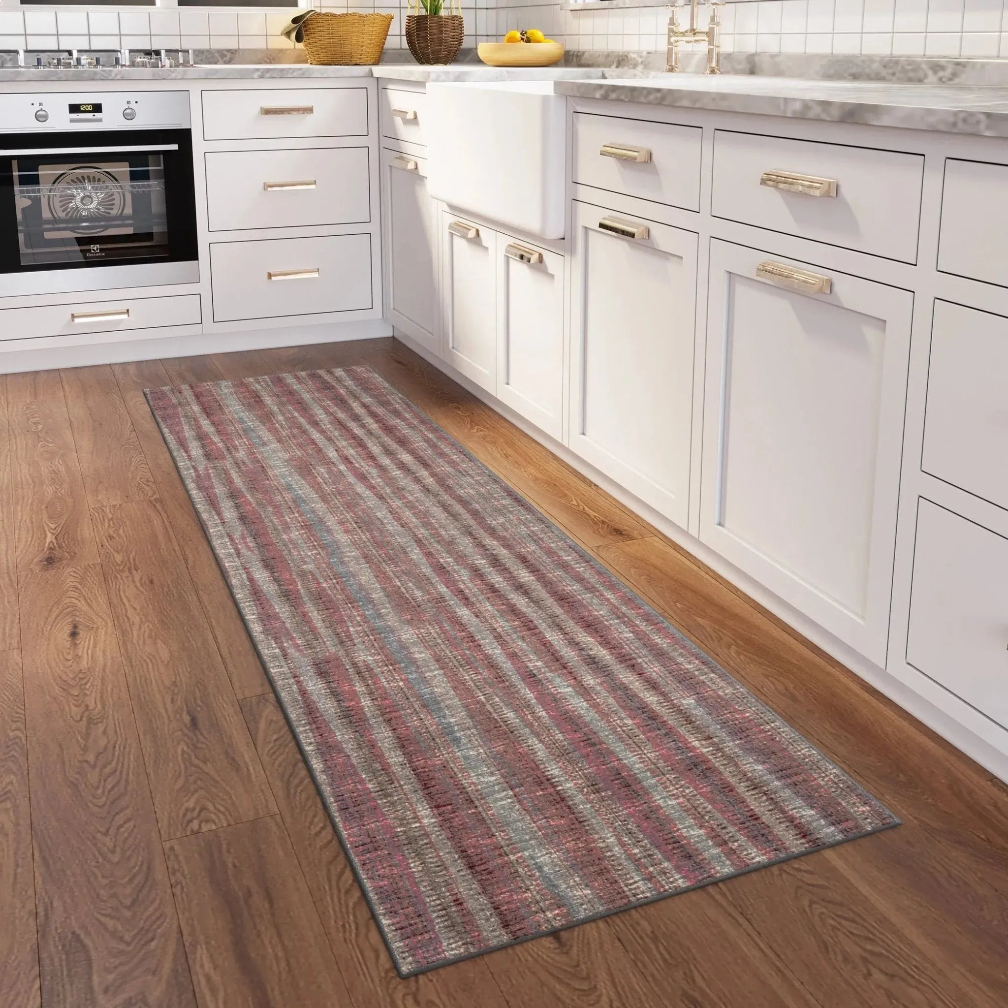 Amador has a hip, modern stripe with incredible color movement. Made of a heavy tight pile that is great for indoor or outdoor areas, it also has a non-skid backing. It is crafted in the USA.