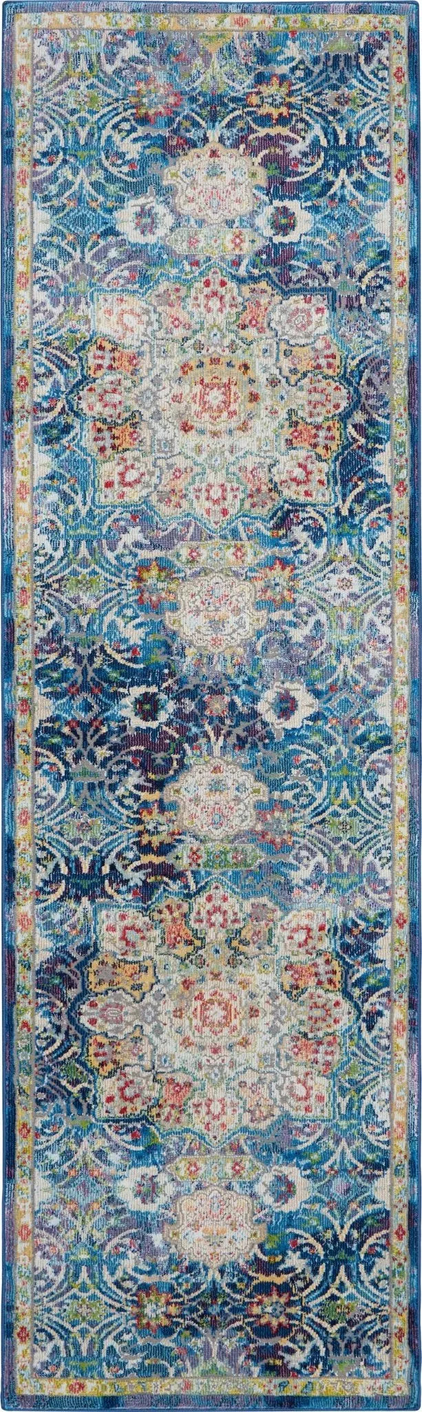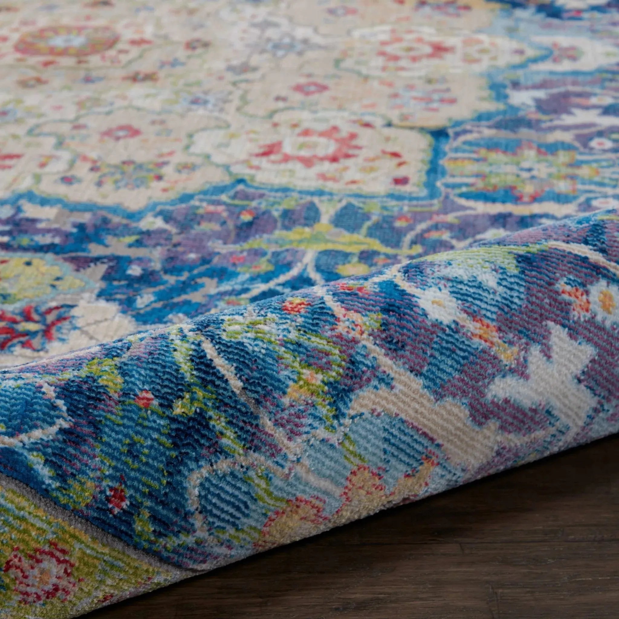 The Parisa PSA06 Denim/Multi Rug comes in various sizes, including 2x10, 5x7, 8x10, 8x11, 9x13, and 12x15 feet, accommodating different room dimensions.