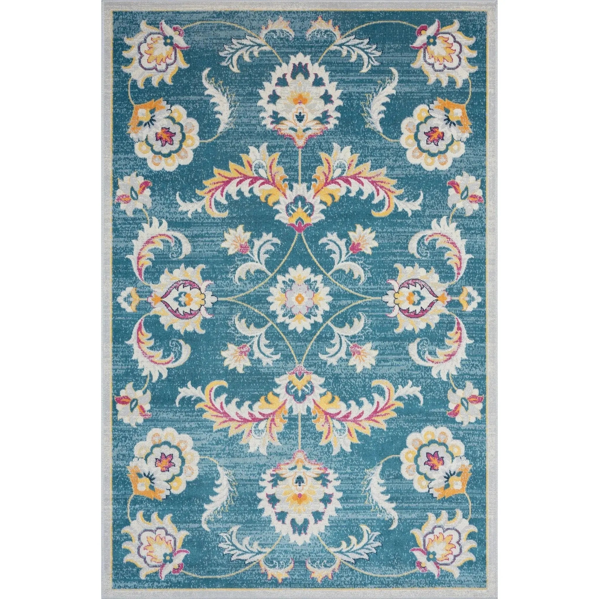Highlighting a variety of traditional and transitional motifs in modern colors, the Antiquity indoor-outdoor rug collection is quite the impressionist ensemble. This latest addition features eye-catching hues of Turkish blue, bold yellow, and bright pink with a balancing gray-white to bring a colorful classic into your space. The distressed abrash background effect highlights the overlayed Jacobean floral filigree motif beautifully. The interwoven design provides eye-catching colors at every angle with the shifting sheen affect in this must-have rug.