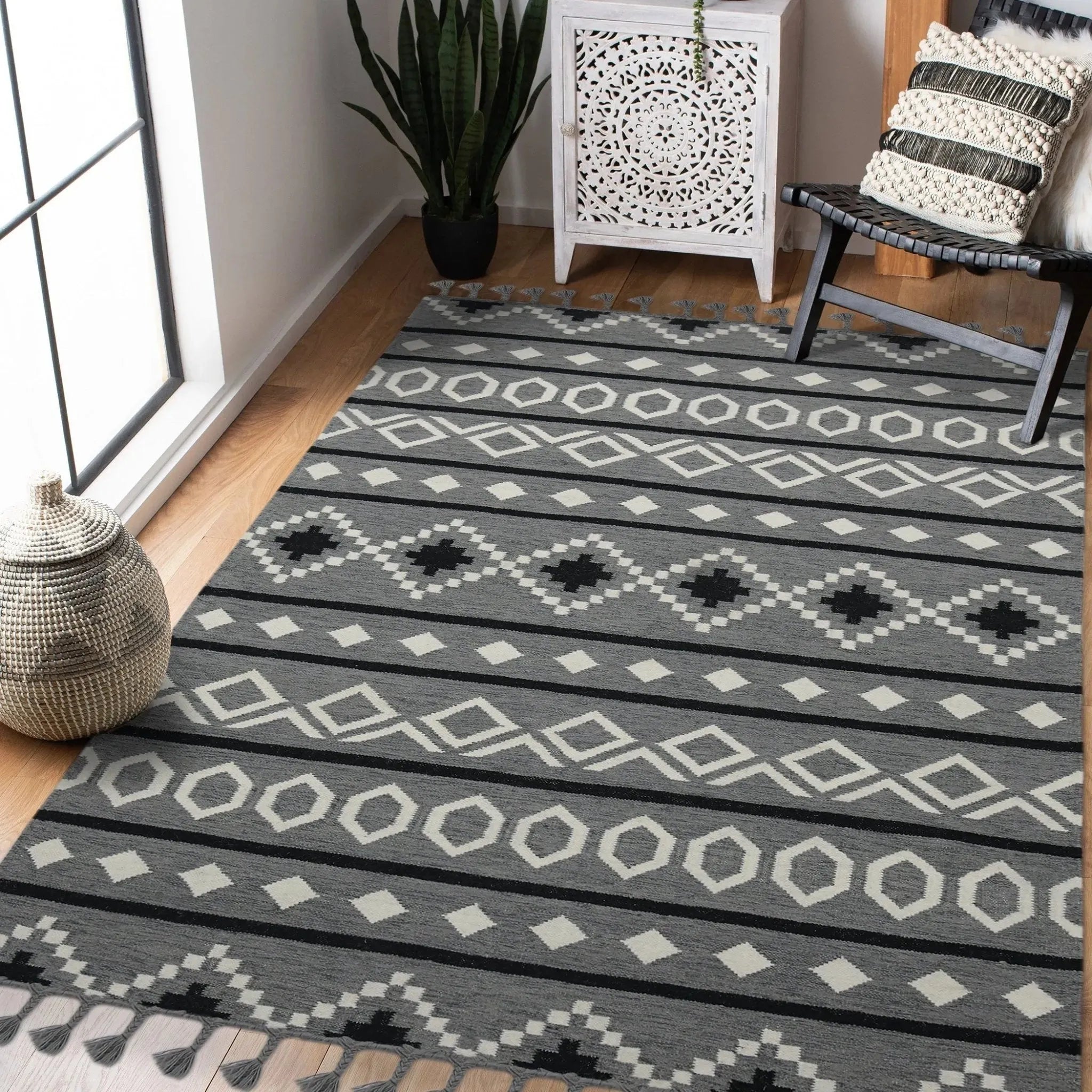 Bring the timeless tribal beauty into your home with this alluring flatweave area rug. Showcasing a combination of eclectic and southwestern designs in neutral colors, this will fit into a variety of home decor styles. Beautifully hand-woven by skilled artisans in India using 100% all-natural wool, this rug will endure the test of time.