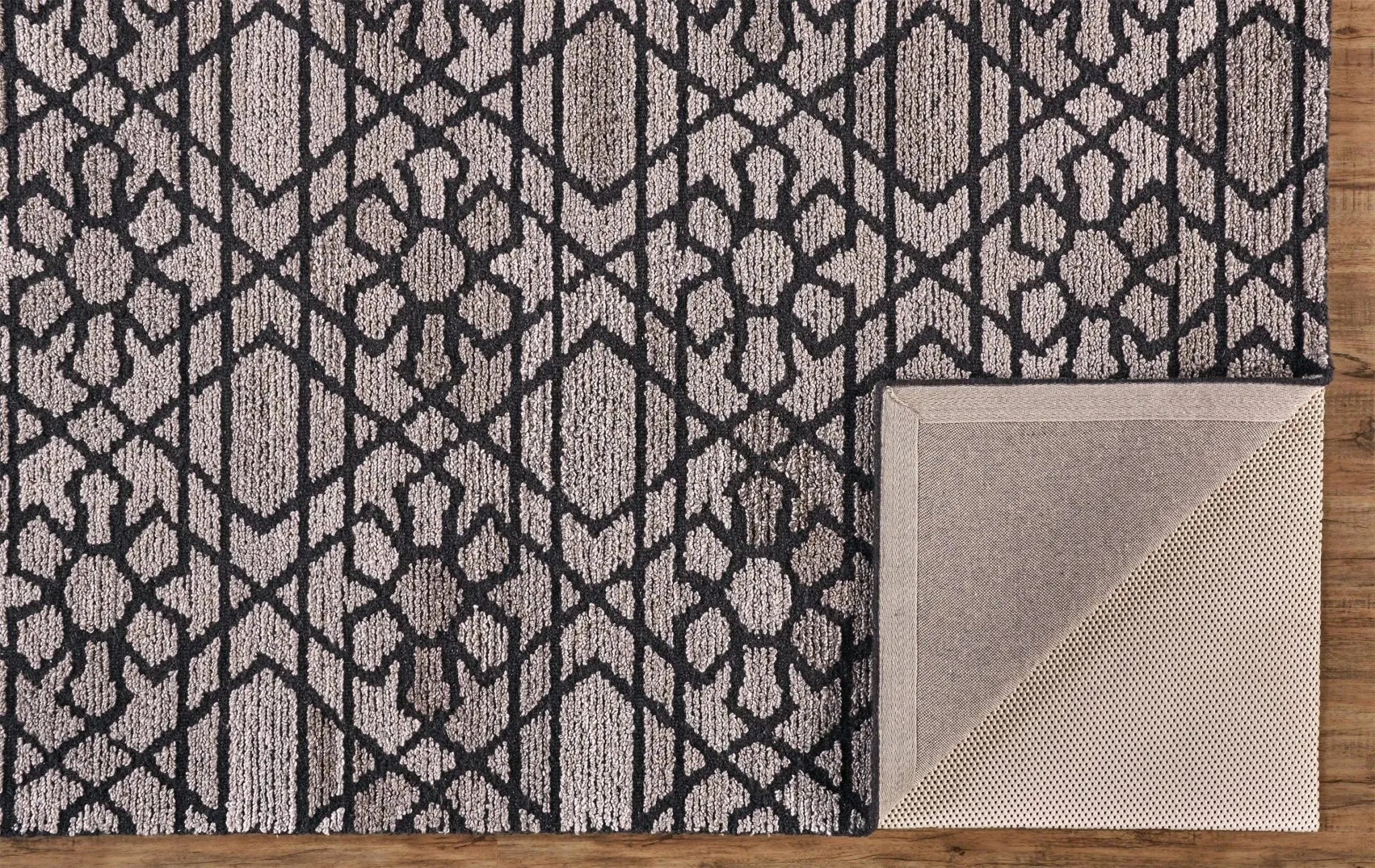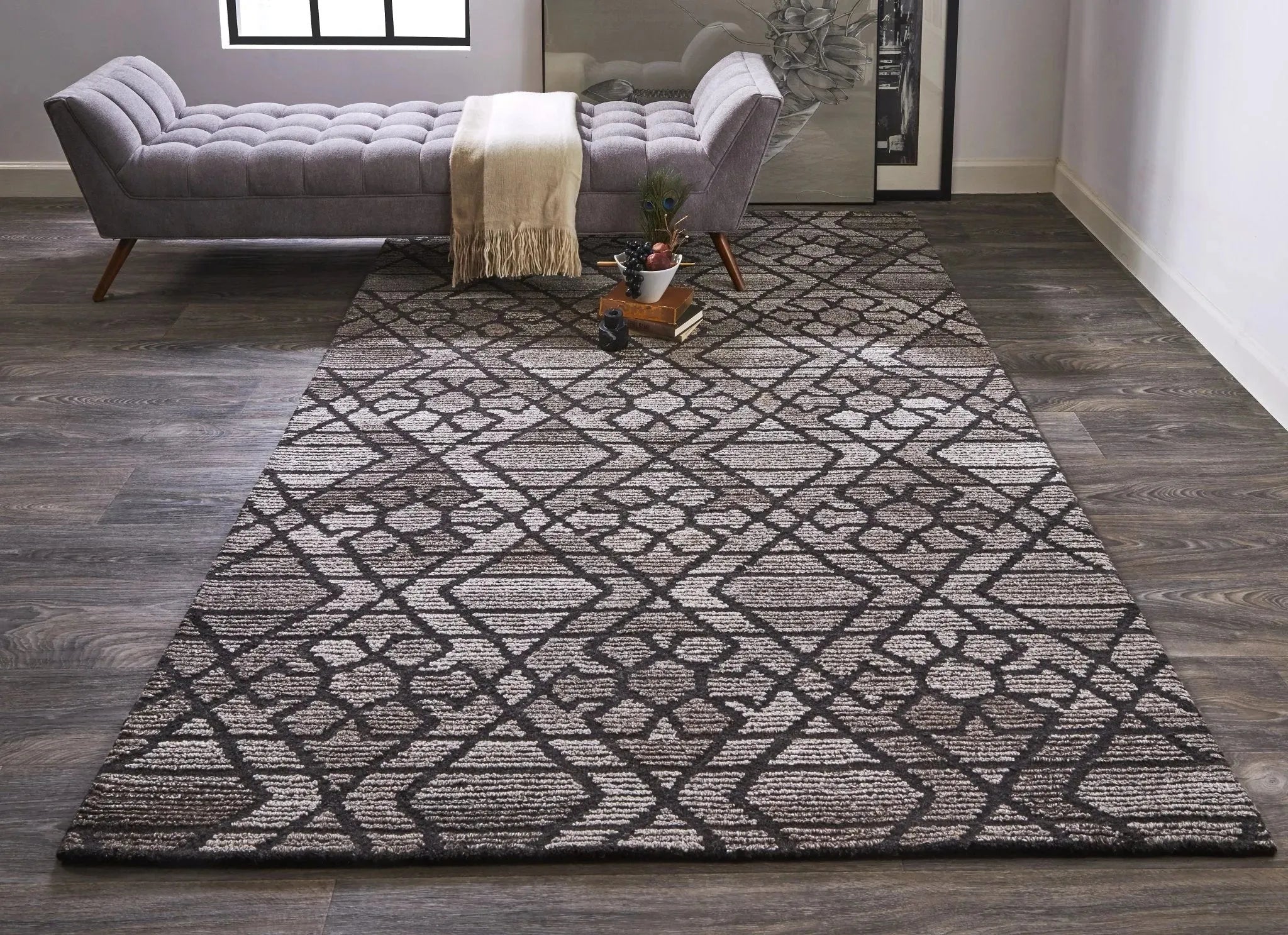 A wool and viscose pile is meticulously hand-tufted in sophisticated grays and warm taupes accented by inky blacks and a subtle sheen in the Asher Collection. The transitional geometric motifs are grounded by the neutral color palette making this collection approachable and easy to decorate with.