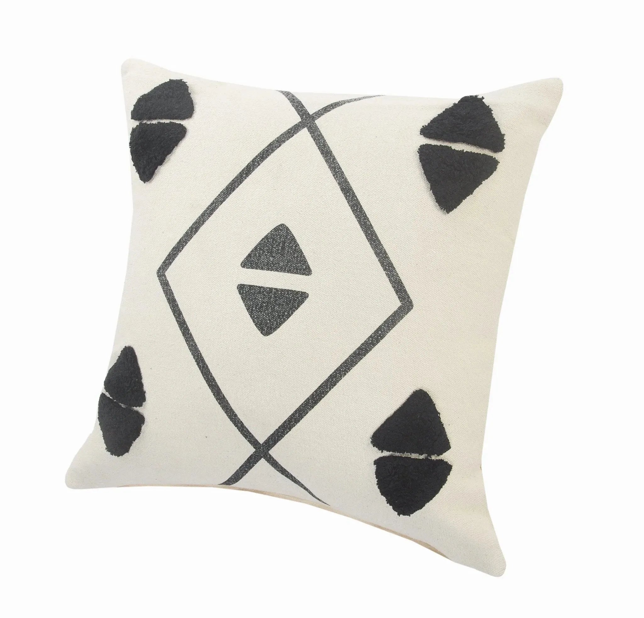 Designed to thrill, our pillow collection will add intricate mastery and eye-pleasing designs to any room. This particular addition dwells perfectly on a comfy couch, bed, or bench. This pillow provides a wonderful balance between minimalist and bohemian style. The tufted triangles are also a subtle addition of texture for your space. The classic coloring allows these pillows to standalone or be easily added to a collection. Prop yourself up in style or just use for delightful interior design. Flat woven in India, these pillows are made to last and are soft to the touch.