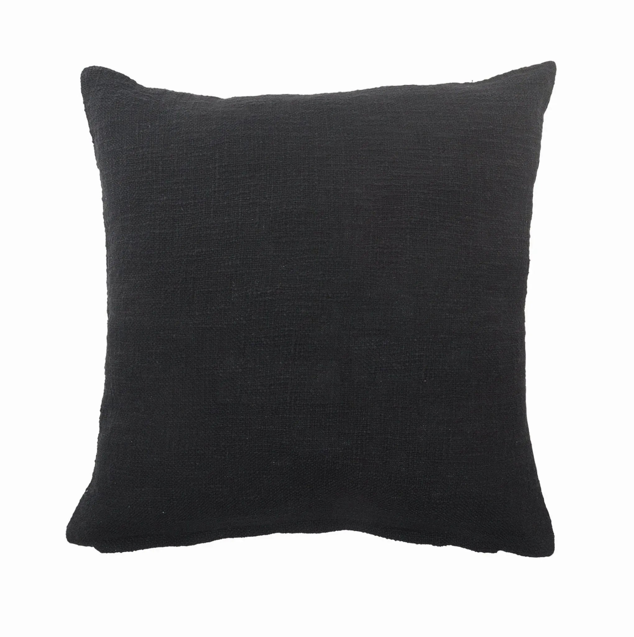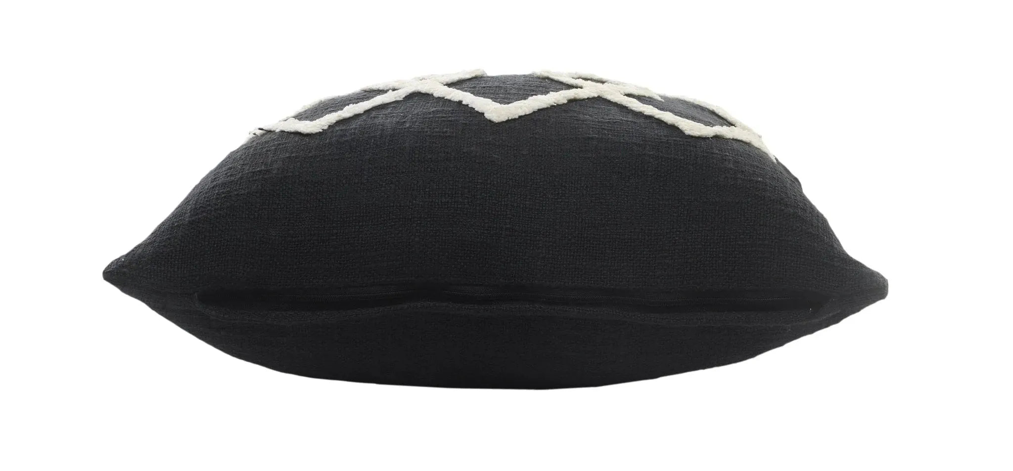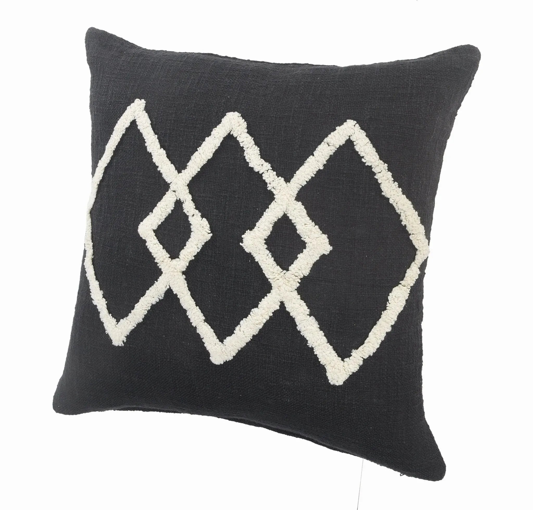 Designed to thrill, our pillow collection will add intricate mastery and eye-pleasing designs to any room. This particular addition dwells perfectly on a comfy couch, bed, or bench. The tufted diamonds are also a stark contrast of texture between the solid black background. The classic coloring allows these pillows to standalone or be easily added to a collection. Prop yourself up in style or just use for delightful interior design. Flat woven in India, these pillows are made to last and are soft to the touch.