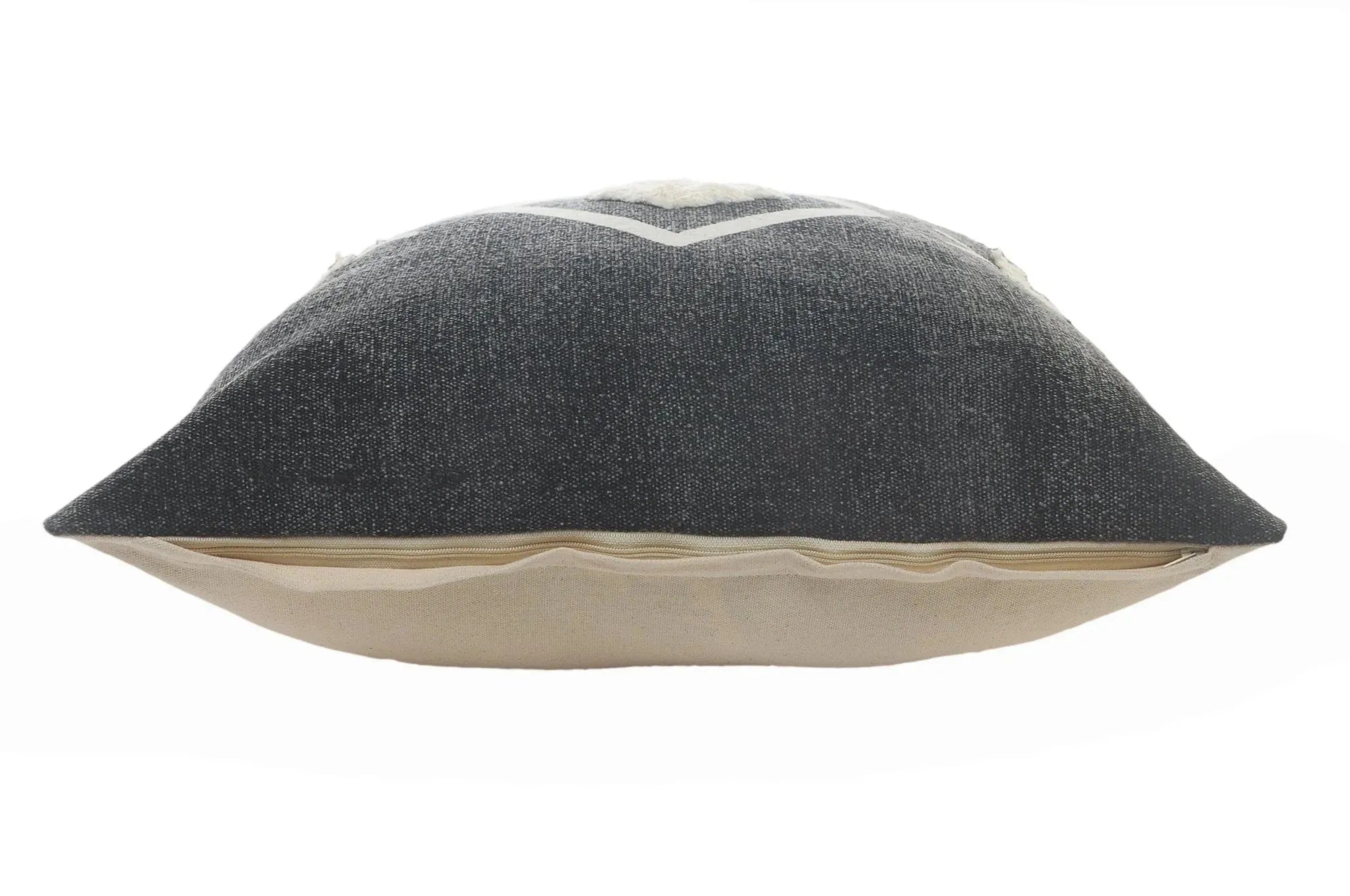 Designed to thrill, our pillow collection will add intricate mastery and eye-pleasing designs to any room. This particular addition dwells perfectly on a comfy couch, bed, or bench. The white tufting also provides stark contrast of texture between the solid black background. The classic coloring allows these pillows to standalone or be easily added to a collection. Prop yourself up in style or just use for delightful interior design. Flat woven in India, these pillows are made to last and are soft to the touch.