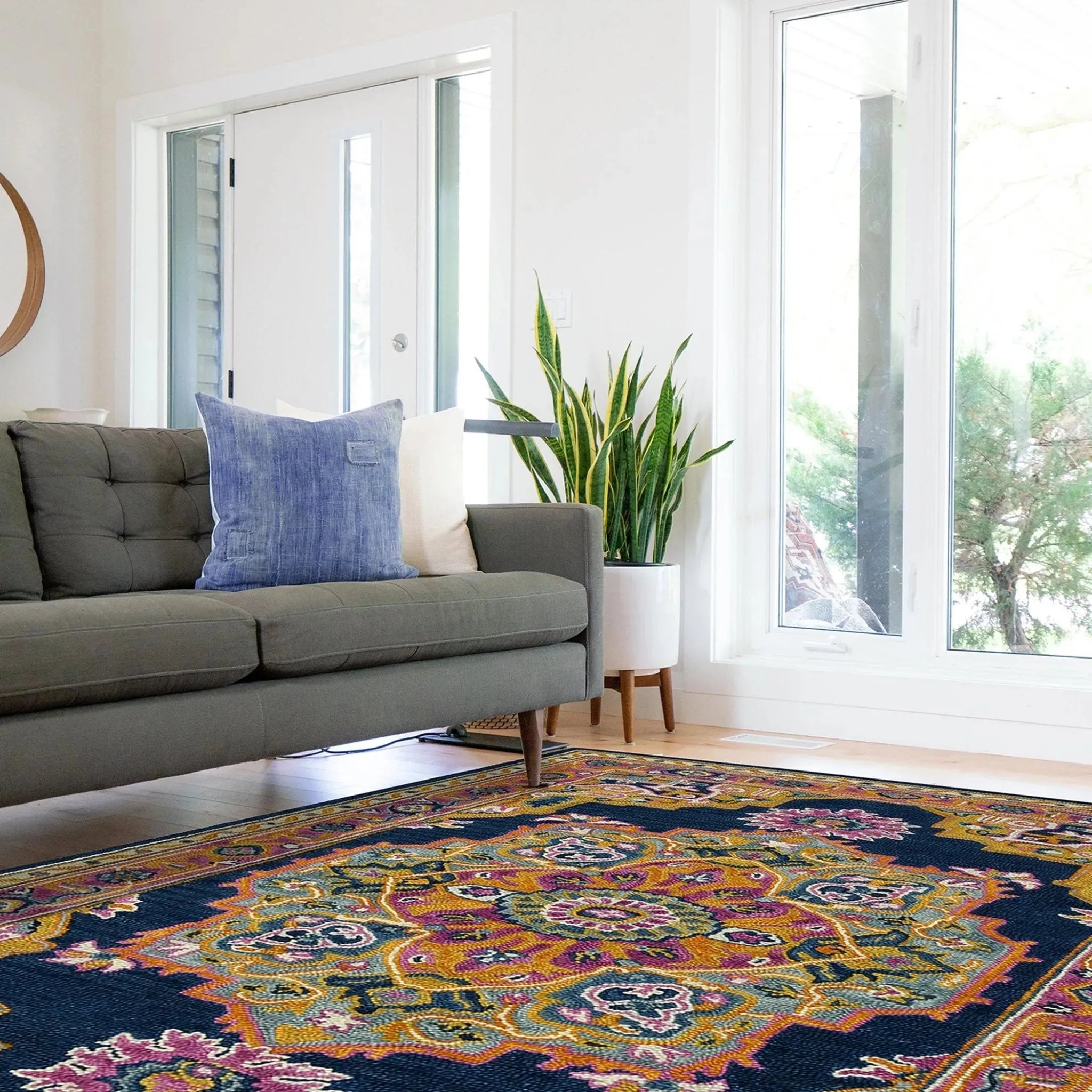 The Parisa PSA06 Denim/Multi Rug comes in various sizes, including 2x10, 5x7, 8x10, 8x11, 9x13, and 12x15 feet, accommodating different room dimensions.