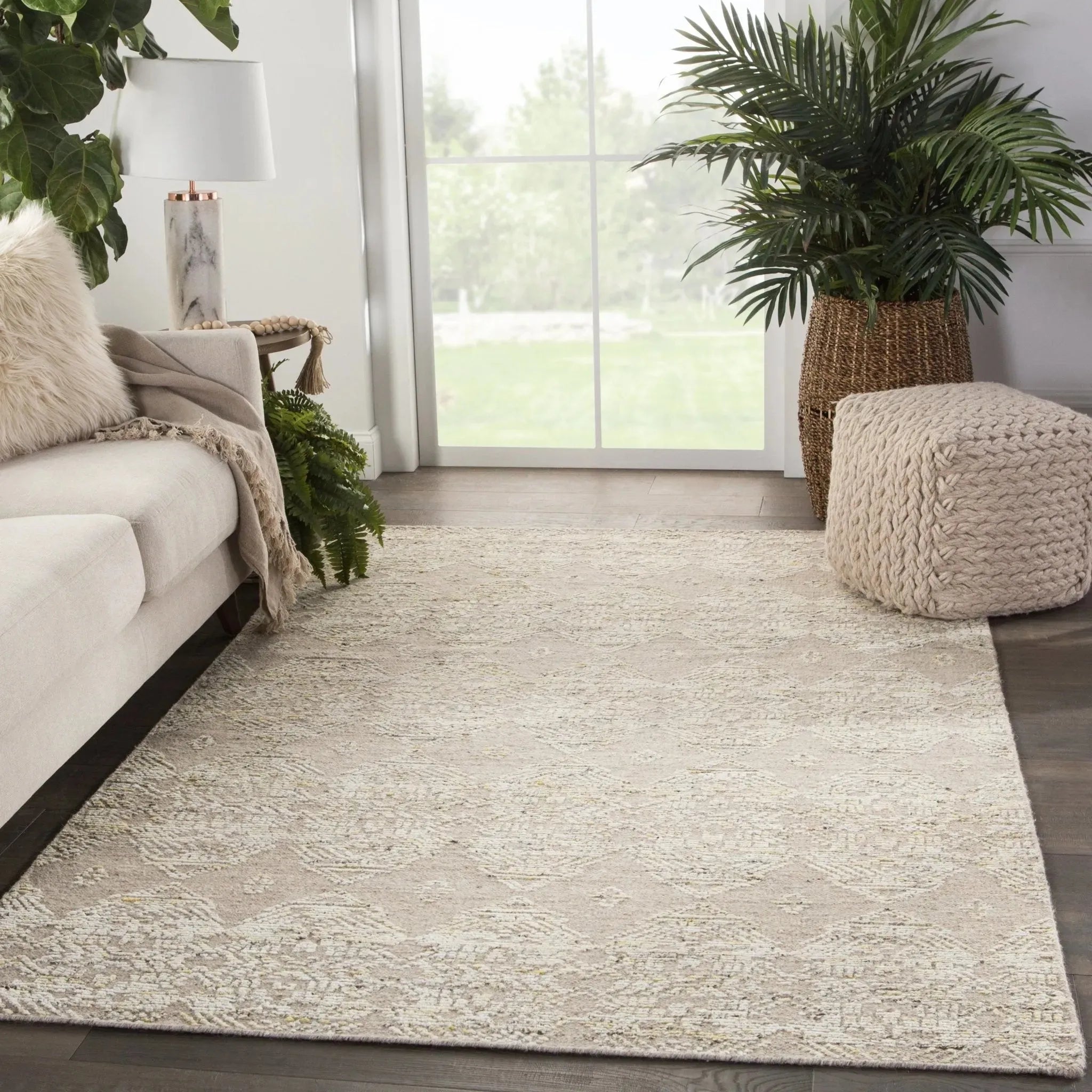 The Burke collection is a timeless and textured assortment of vintage-inspired tone-on-tone designs. The Dentelle area rug features a hand-knotted wool, polyester, and viscose construction with an elegant tribal repeat pattern of carved geometric detailing. The ivory and beige colorway showcases hints of gold for easy versatility in any style home. This rug is perfect for your living room, dining room, den, bedroom, or any living space