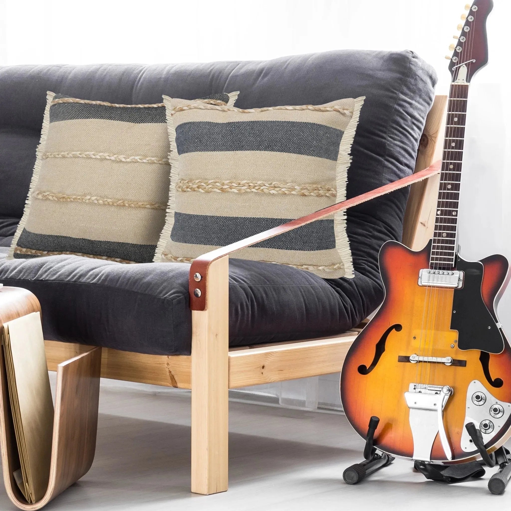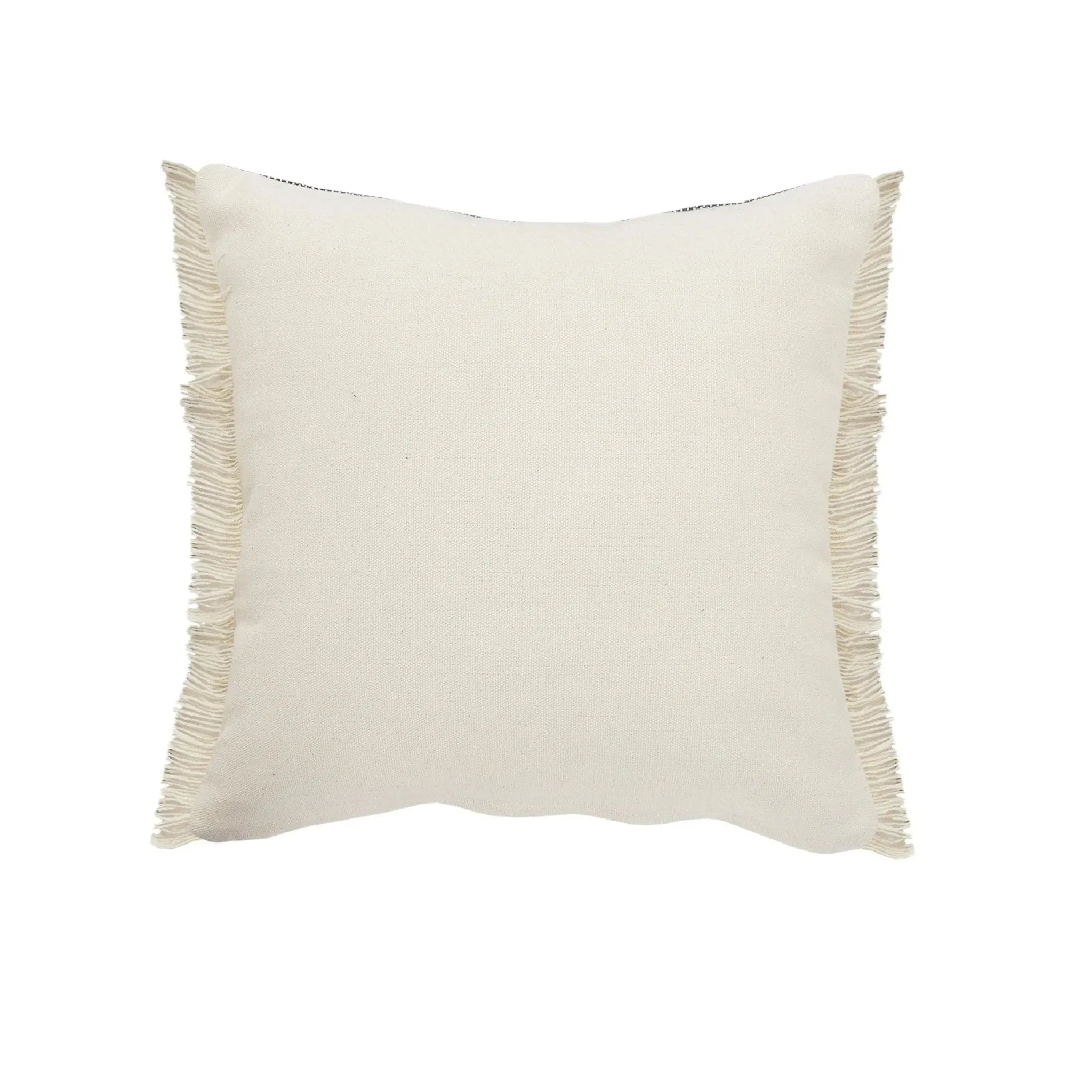 Designed to thrill, our pillow collection will add intricate mastery and eye pleasing designs to any room. This addition dwells perfectly on a comfy couch, bed, or bench. This pillow is a wonderful accent for the coastal home looking to add an elevated classic to their collection. This piece features a well-toned denim and taupe background, textured jute braiding, and bordered fringe for additional flare. Handcrafted with the customer in mind, there is no compromise of comfort and style with the pillow line we create.