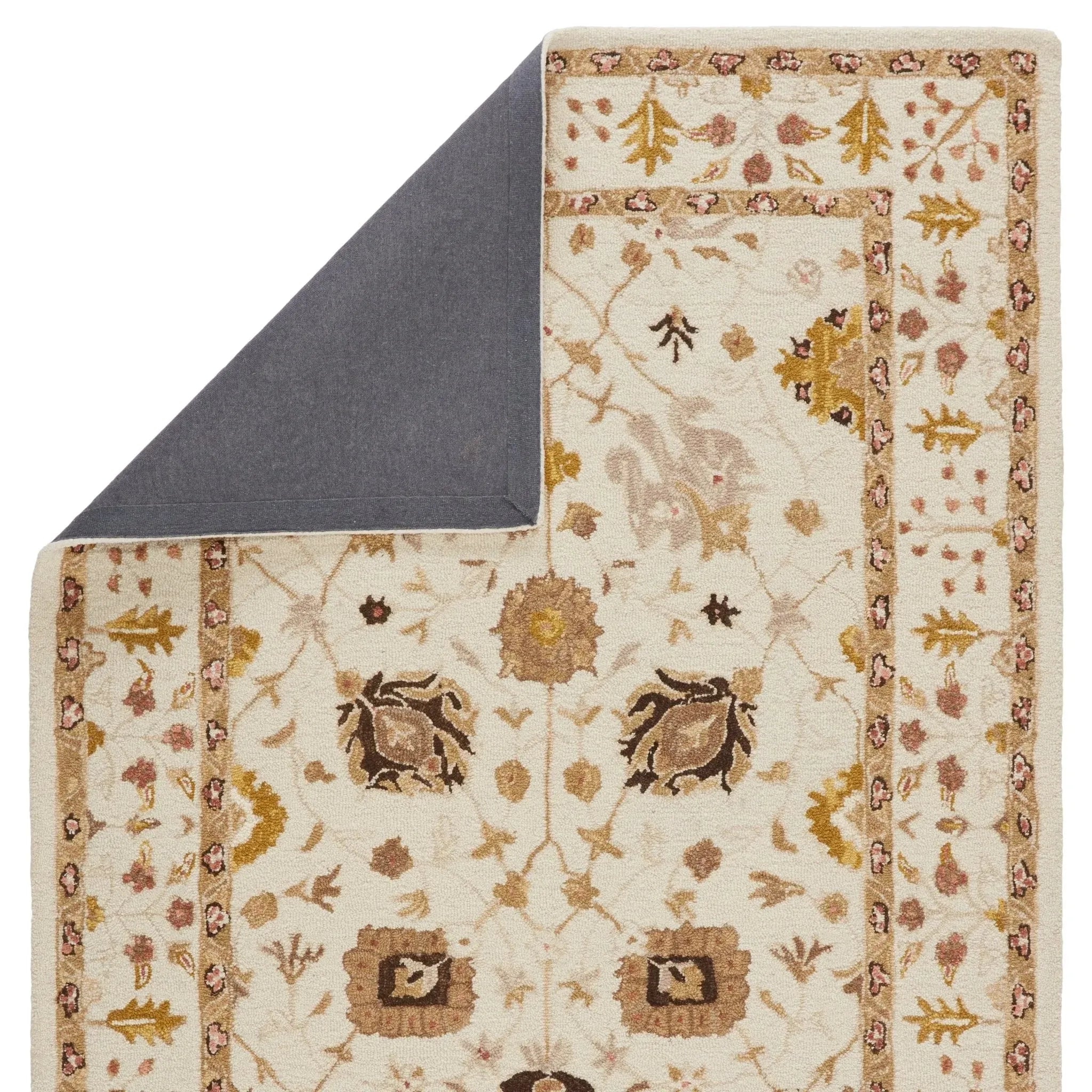 The hand-tufted Cardamom collection boasts vivid jewel tones and uniquely distressed Turkish motifs, crafted to emulate traditional sun-faded, vintage designs. The Ahava rug showcases an open, floral medallion motif in a mix of bright and earthy hues including cream, gold, rosy pink, brown, and tan. Inspired by the artistic imperfection of dye-lot changes in perfectly aged wool textiles, the looped pile of this rug features tonal colorway depth and textural dimension.