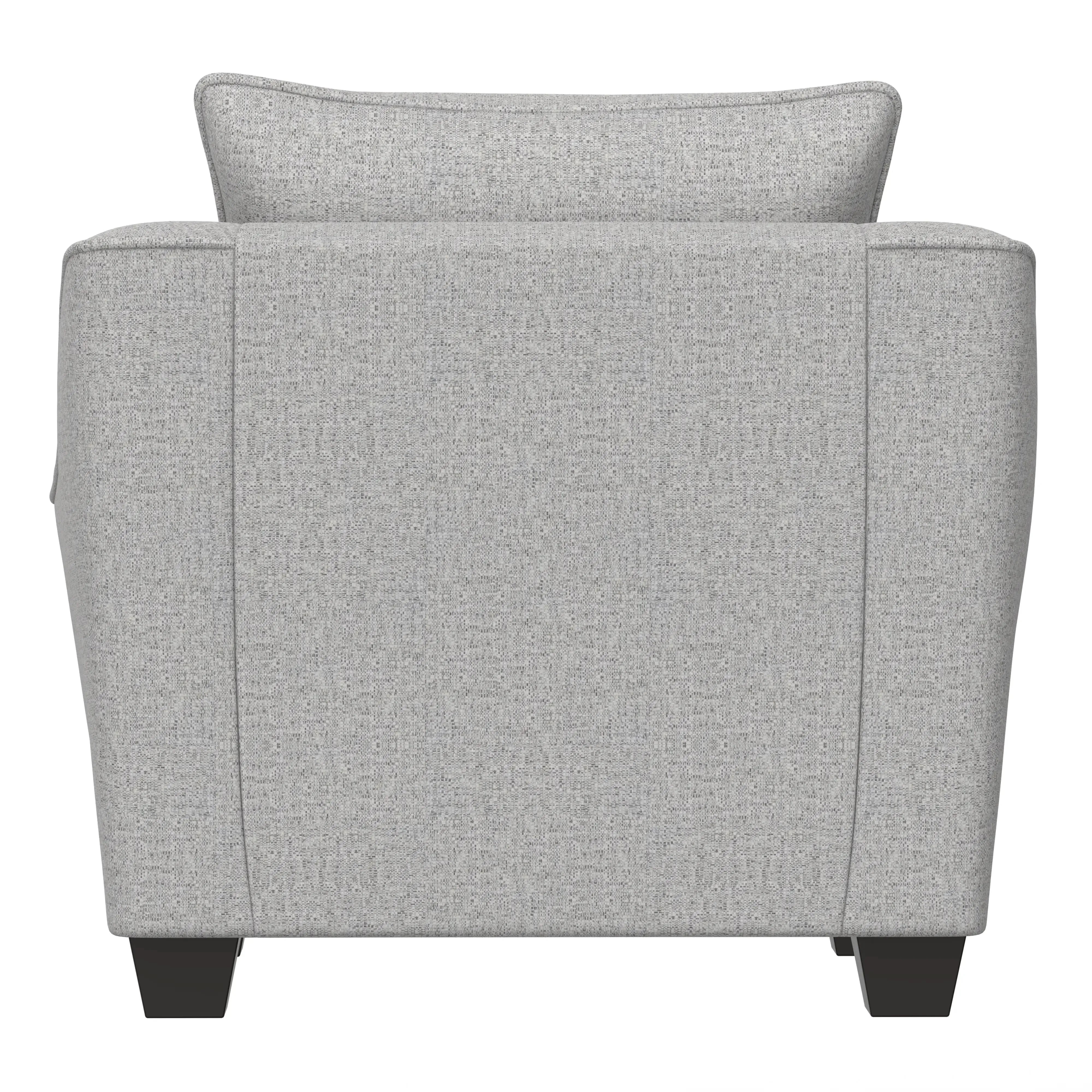 Understated flair and cozy chenille fabric wait for you in the Casey Collection. The classic contemporary frame is updated with flared arms accentuated by welting for a subtle saddle shape. Pillow-shaped back cushions blend the casual appeal of a scatterback with the tidiness of a more traditional box cushion. Upholstered in soft light gray with flecks of dark gray for added depth, the Casey Collection includes a sofa, loveseat, and chair, accompanied by an accent oval ottoman featuring hidden castors. Flip the top from cushioned upholstery to a dark wood tray to discover hidden storage. Complete the look by tossing on the included accent pillows in a blue and gray geometric print and a textured stripe in shades of navy. With Casey, every moment is a home run in comfort.
