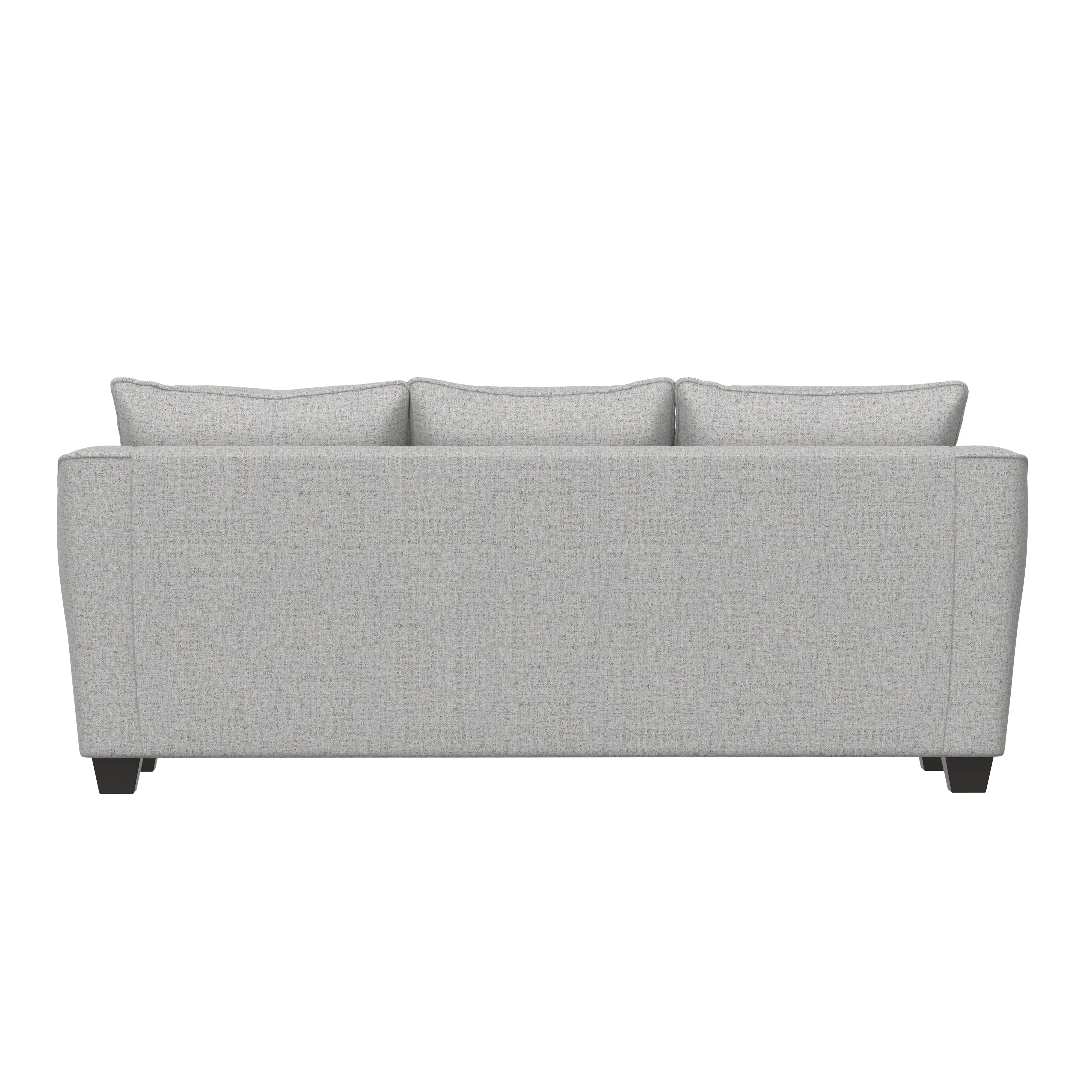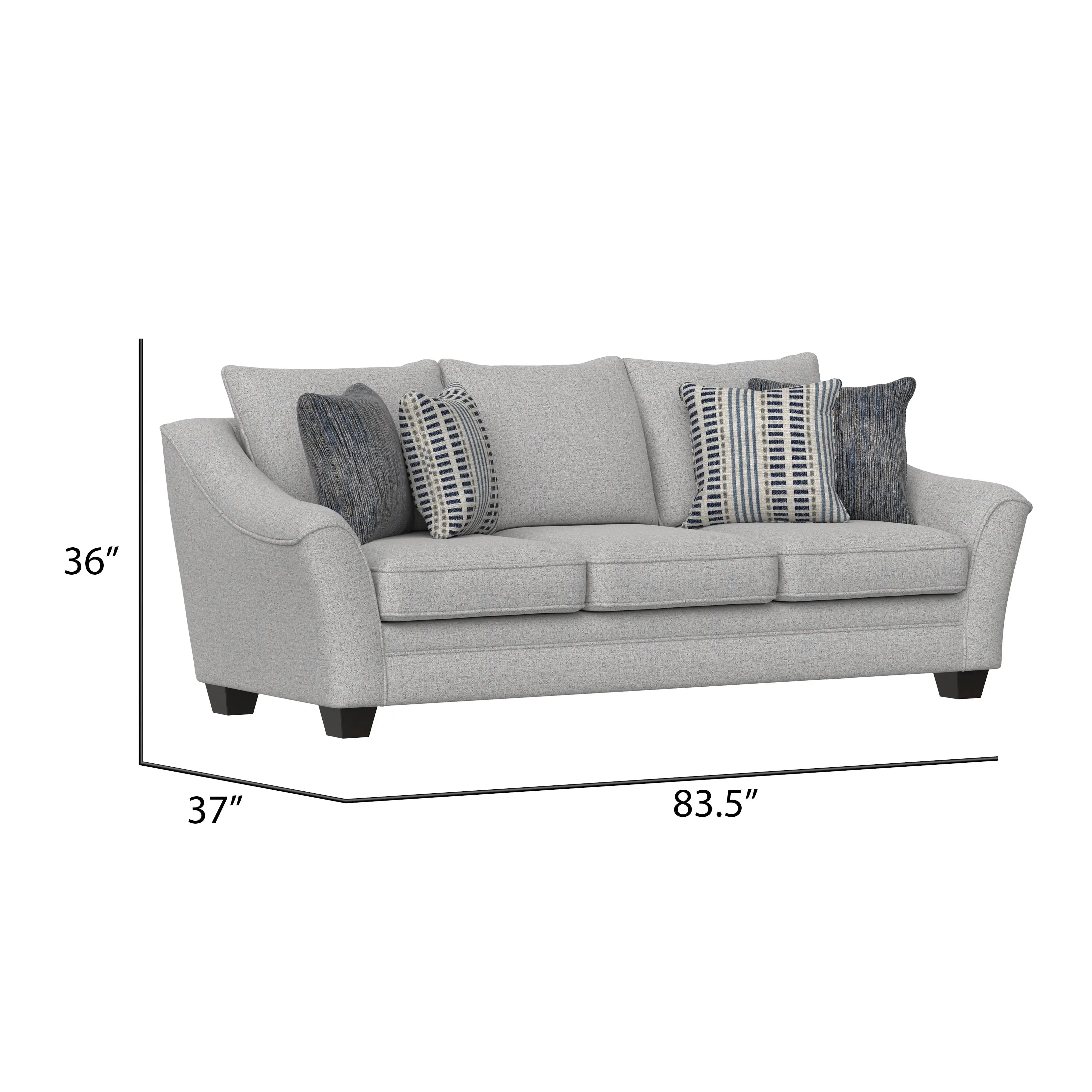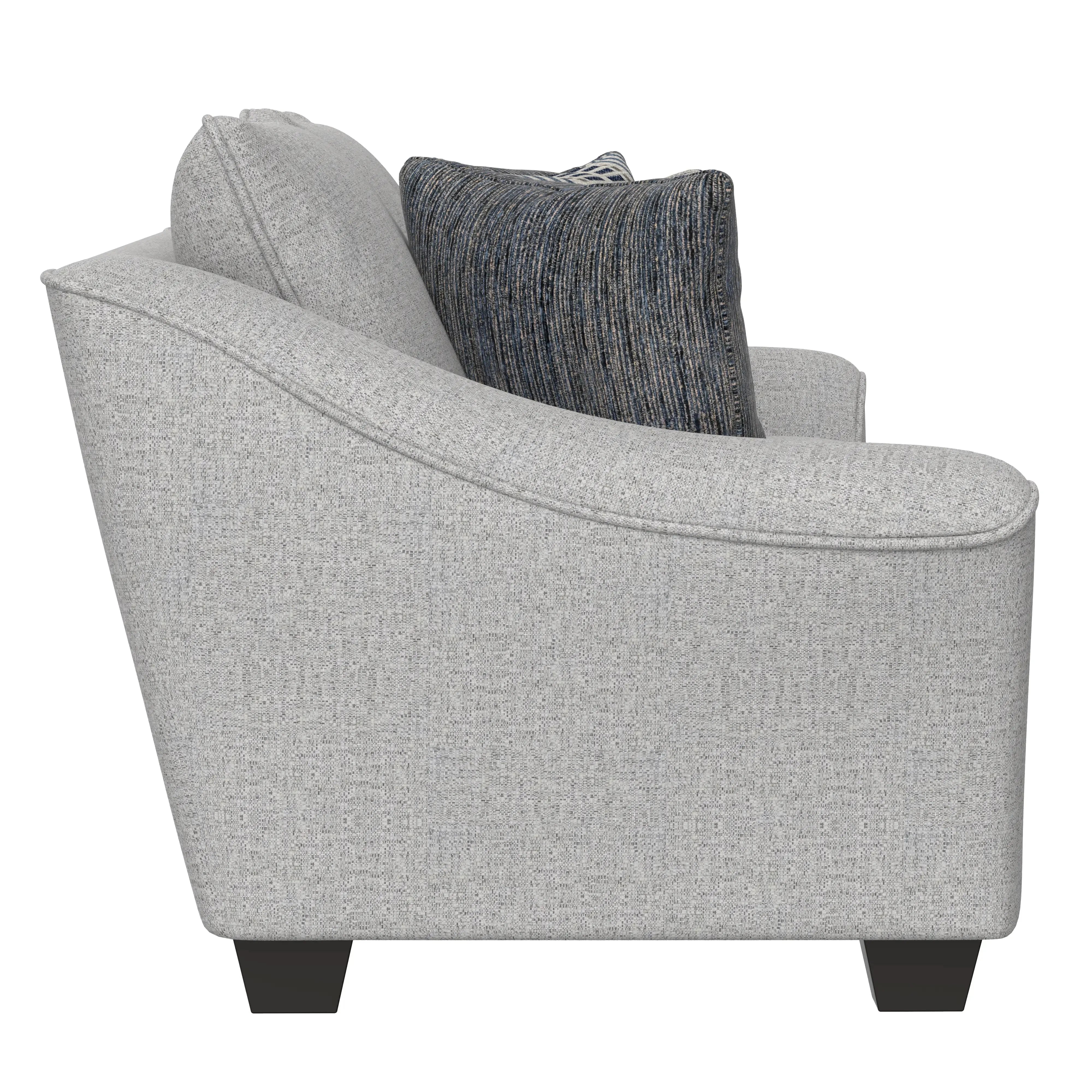 Understated flair and cozy chenille fabric wait for you in the Casey Collection. The classic contemporary frame is updated with flared arms accentuated by welting for a subtle saddle shape. Pillow-shaped back cushions blend the casual appeal of a scatterback with the tidiness of a more traditional box cushion. Upholstered in soft light gray with flecks of dark gray for added depth, the Casey Collection includes a sofa, loveseat, and chair, accompanied by an accent oval ottoman featuring hidden castors. Flip the top from cushioned upholstery to a dark wood tray to discover hidden storage. Complete the look by tossing on the included accent pillows in a blue and gray geometric print and a textured stripe in shades of navy. With Casey, every moment is a home run in comfort.
