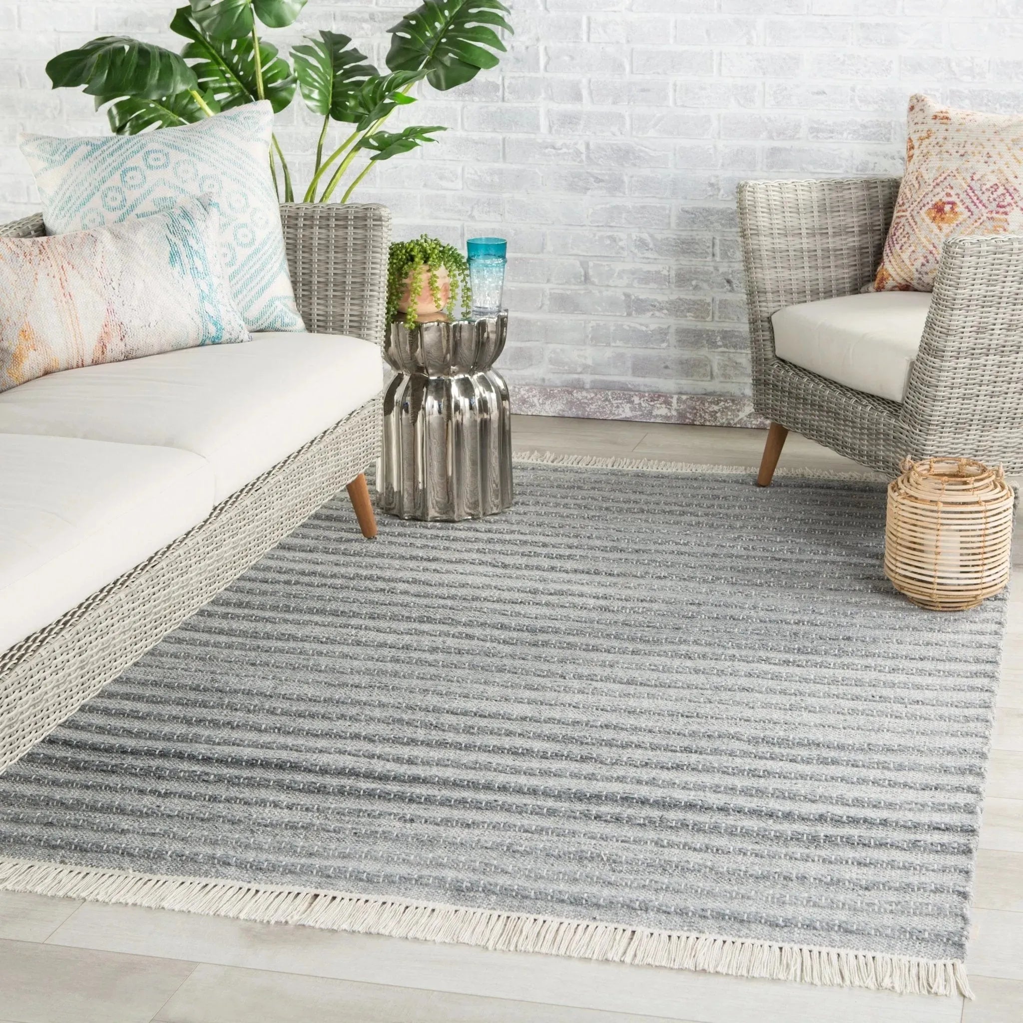 The handwoven Castillo collection features a soft feel and relaxed, versatile style. The Torre area rug showcases a blend of cool gray and cream tones for a grounding, neutral look. Crafted of PET yarn, or recycled plastic, this durable and textured rug brings warmth and inviting appeal to indoor and outdoor spaces.