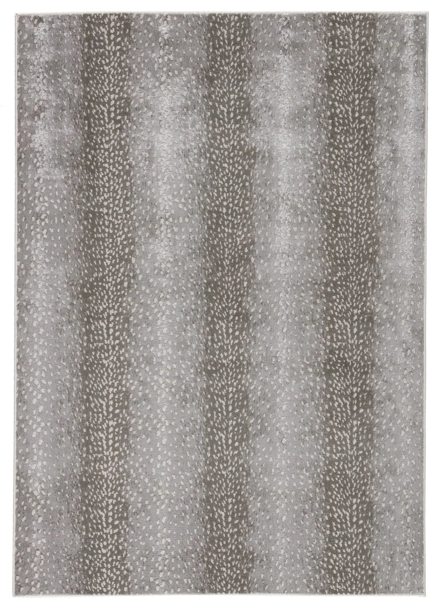 The show-stopping yet surprisingly versatile appeal of the Catalyst collection brings contemporary edge to any home. The gray and silver Axis rug's sophisticated, spotted animal print is familiar and chic, perfect for adding texture and intrigue to a room. This machine-made rug features metallic polyester fibers blended with stain-resistant polypropylene for a brilliant sheen from various perspectives.