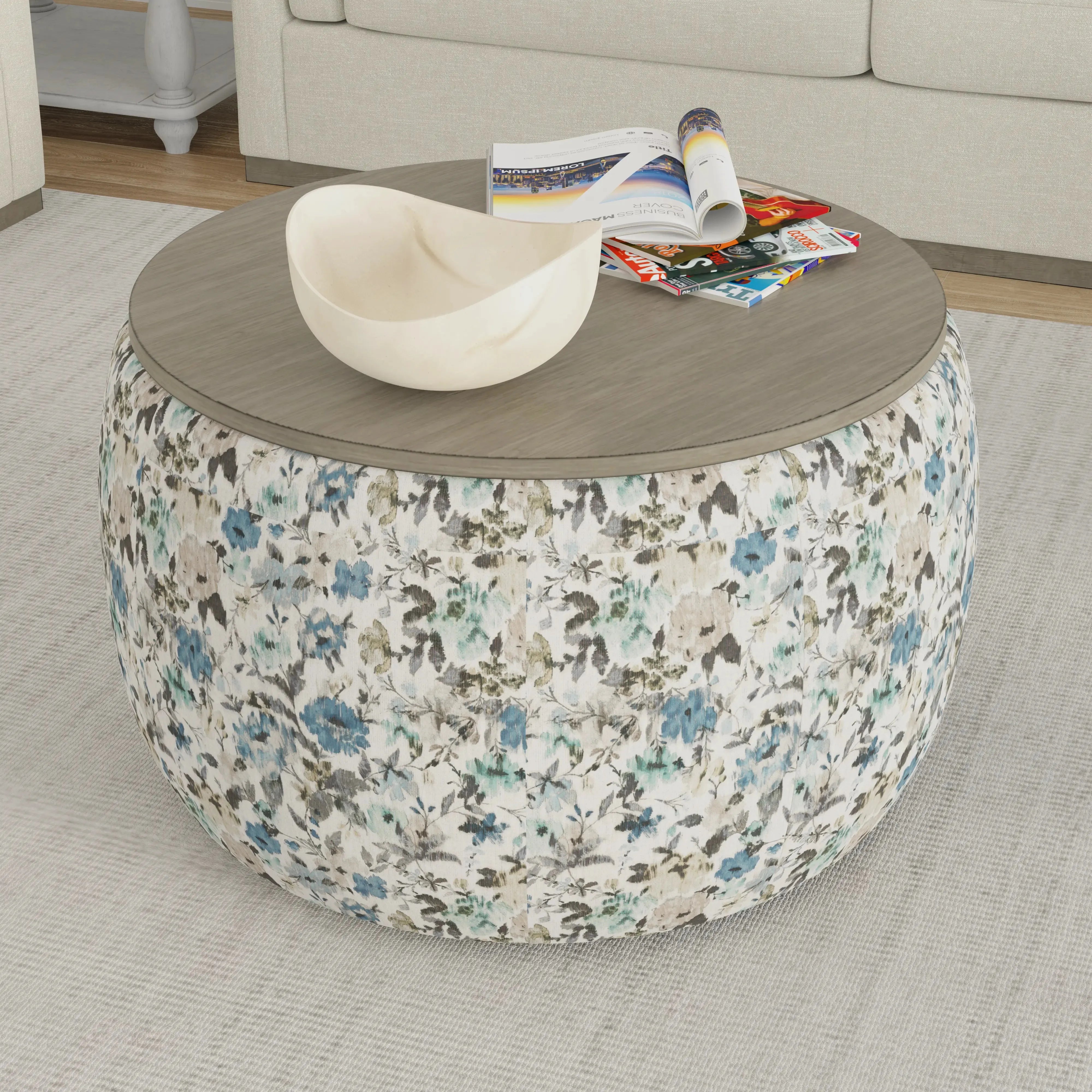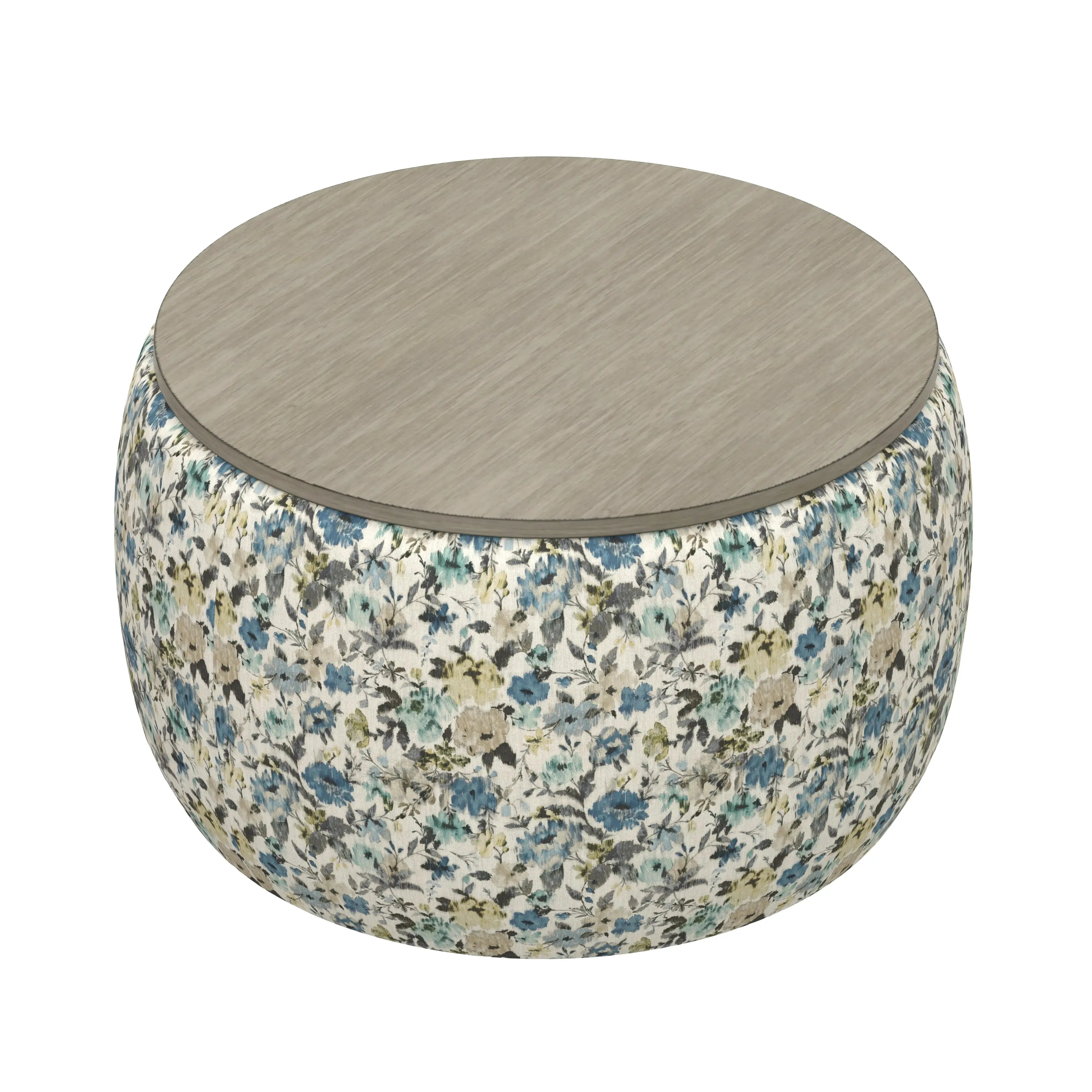 Cecily draws quiet attention with its balanced blend of structural and tailored shapes. Starting with a solid wood floating base, soft, cream-colored fabric covers the uncluttered lines and clean silhouette of the sofa, loveseat, and chair. Swivel chairs in floral and windowpane patterns are trimmed on all edges with shapely wood for stylish accessories. Completing the ensemble is a coordinating ottoman with hidden storage and castors to glide with ease. The Cecily collection will be the belle of your room with its transitional appeal.
