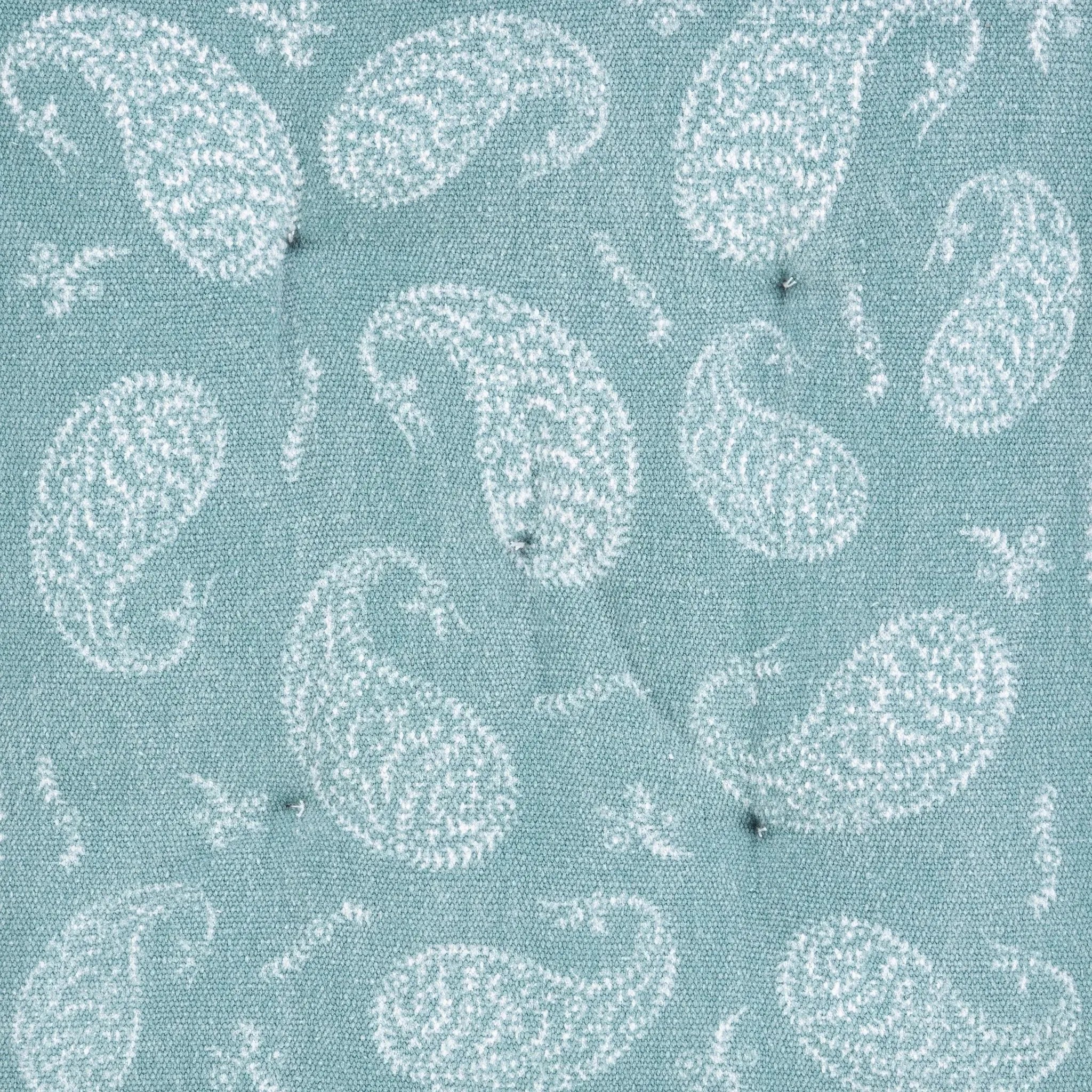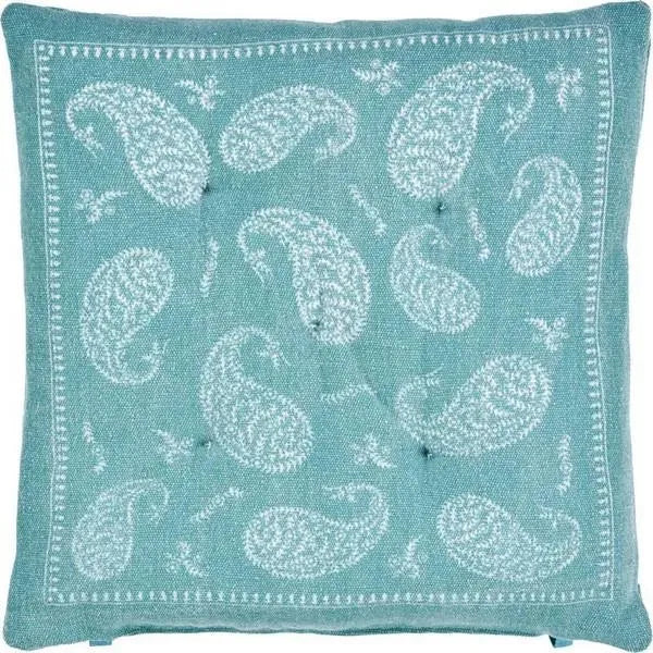 With an intricate paisley design, this chair cushion adds a lovely flair to your kitchen, dining room, or even sunroom! The bordering accent to this piece is quite eye catching! The possibilities are endless with this versatile cushion. This particular edition to the collection features a square shaped design with a thick cushion. Ribbon ties allow this item to be tied securely to a chair or simply tucked away and placed neatly in the chair for a more relaxed look. The soft fill will allow for a new, comfortable edition to your home!