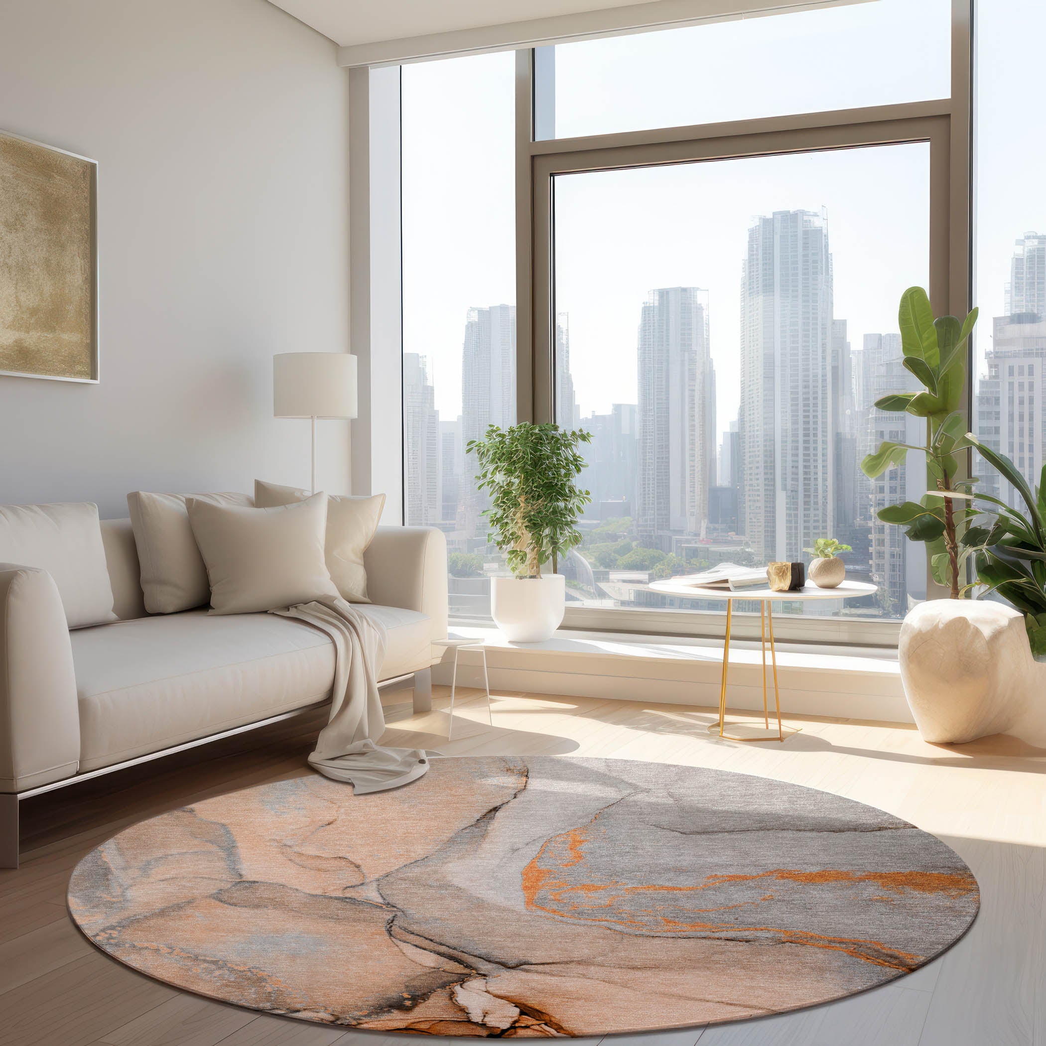Immerse your home in tranquility with our transitional area rug, boasting an alcohol ink-inspired design rendered in soft watercolors. Perfect for both indoor and outdoor use, the UV-stabilized rug features an ultra-thin construction with a non-skid backing, eliminating the need for a separate rug pad. Machine-washable and friendly to both family and pets, it's a breeze to maintain.