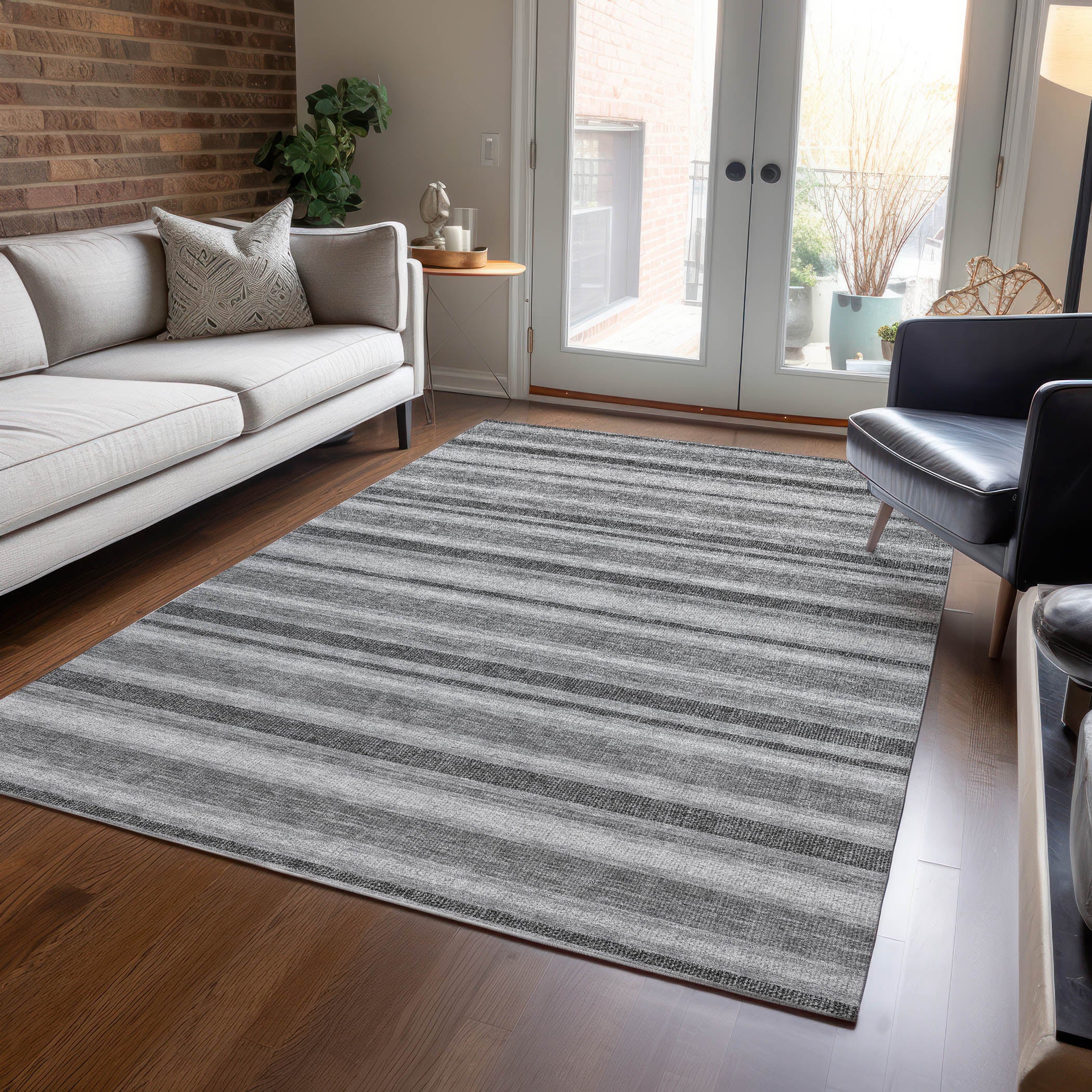 Make a bold statement in your space with our area rug featuring stripes that offer complementing colors to catch the eye and add energy to the room. This transitional striped rug effortlessly enhances any décor. It is UV stabilized for indoor or outdoor use, and its ultra-thin construction with an incorporated non-skid backing eliminates the need for a separate rug pad. Machine-washable and family and pet-friendly, this rug offers convenience and versatility.