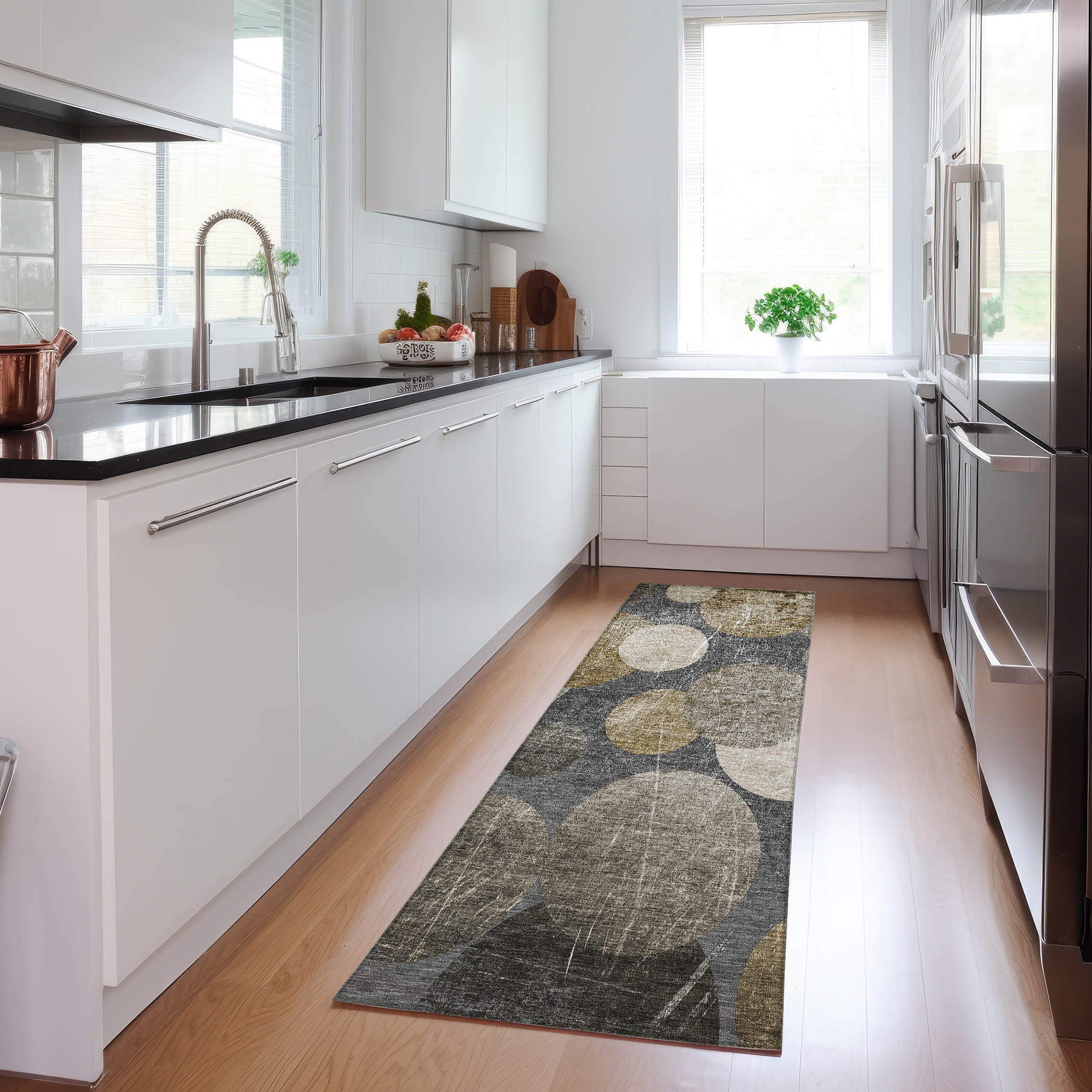 Immerse yourself in the soothing aura of our transitional organic rug, beautifully crafted with floating oval-shaped motifs that invoke a pleasing and gentle feel. This exceptional rug effortlessly enhances the charm of your décor. Benefitting from UV stabilization, it is perfectly suited for both indoor and outdoor use. Its ultra-thin construction features an incorporated non-skid backing, rendering a separate rug pad unnecessary. Machine-washable, family and pet-friendly.