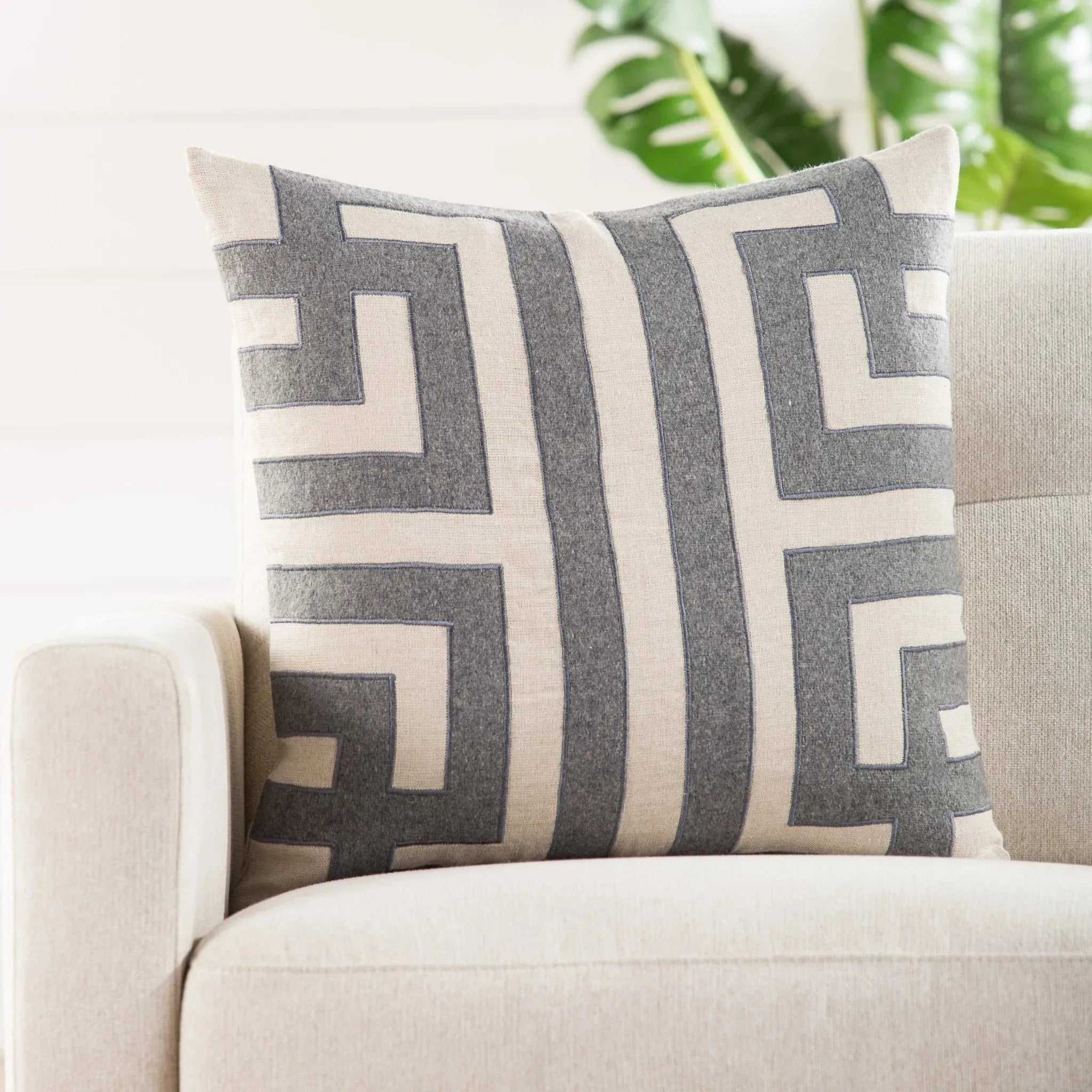 Showcasing a contemporary take on the globally inspired Greek key pattern, this Nikki Chu throw pillow makes a bold statement on sofas and beds. A gray and beige colorway lends a sophisticated touch to this embroidered linen cushion.