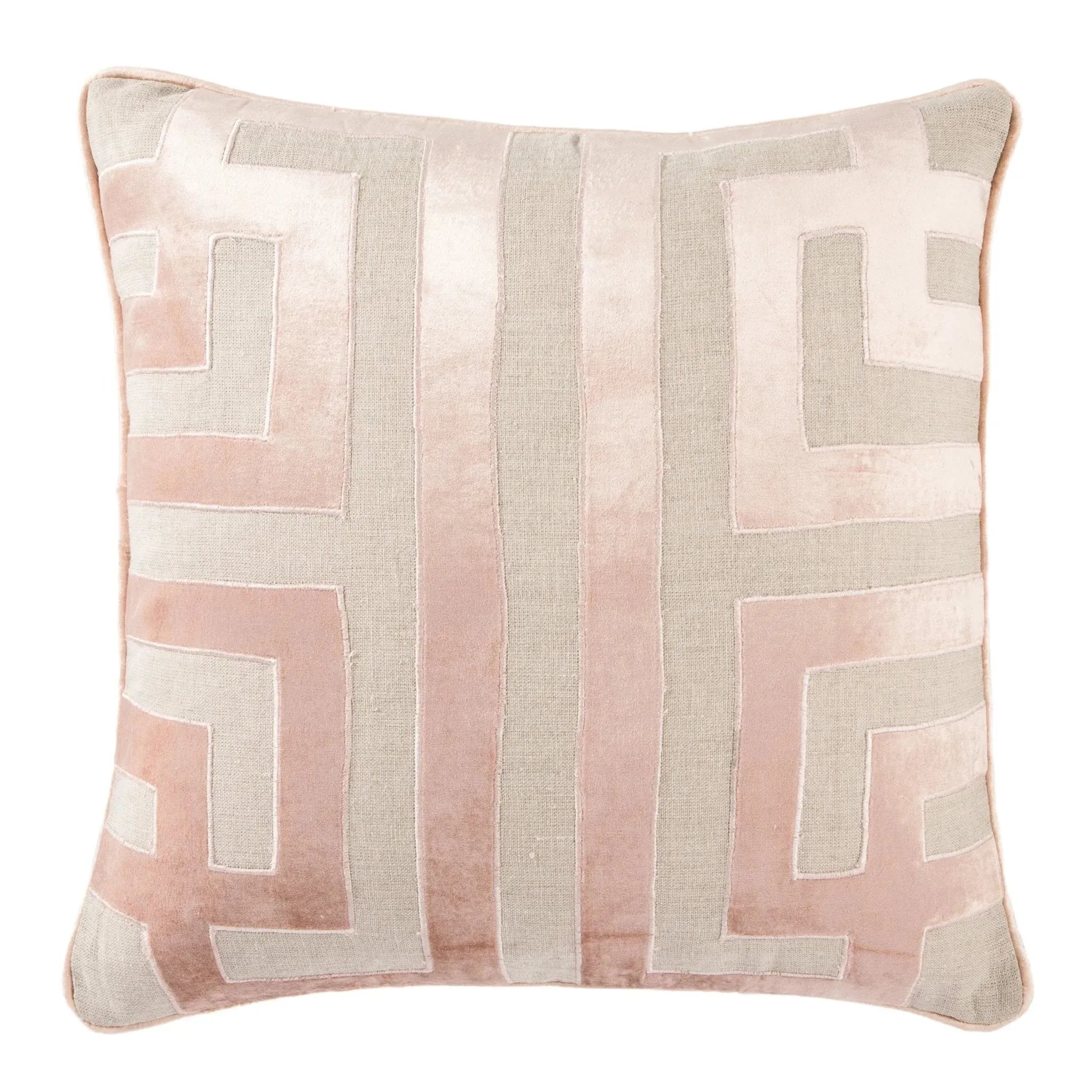 Showcasing a contemporary take on the globally inspired Greek key pattern, this Nikki Chu throw pillow makes a bold statement on sofas and beds. A soft pink and beige colorway lends an elegant touch to this velvet and linen cushion, while piped edges offer sophisticated detailing.