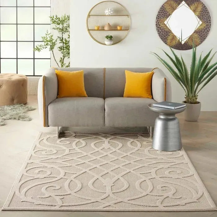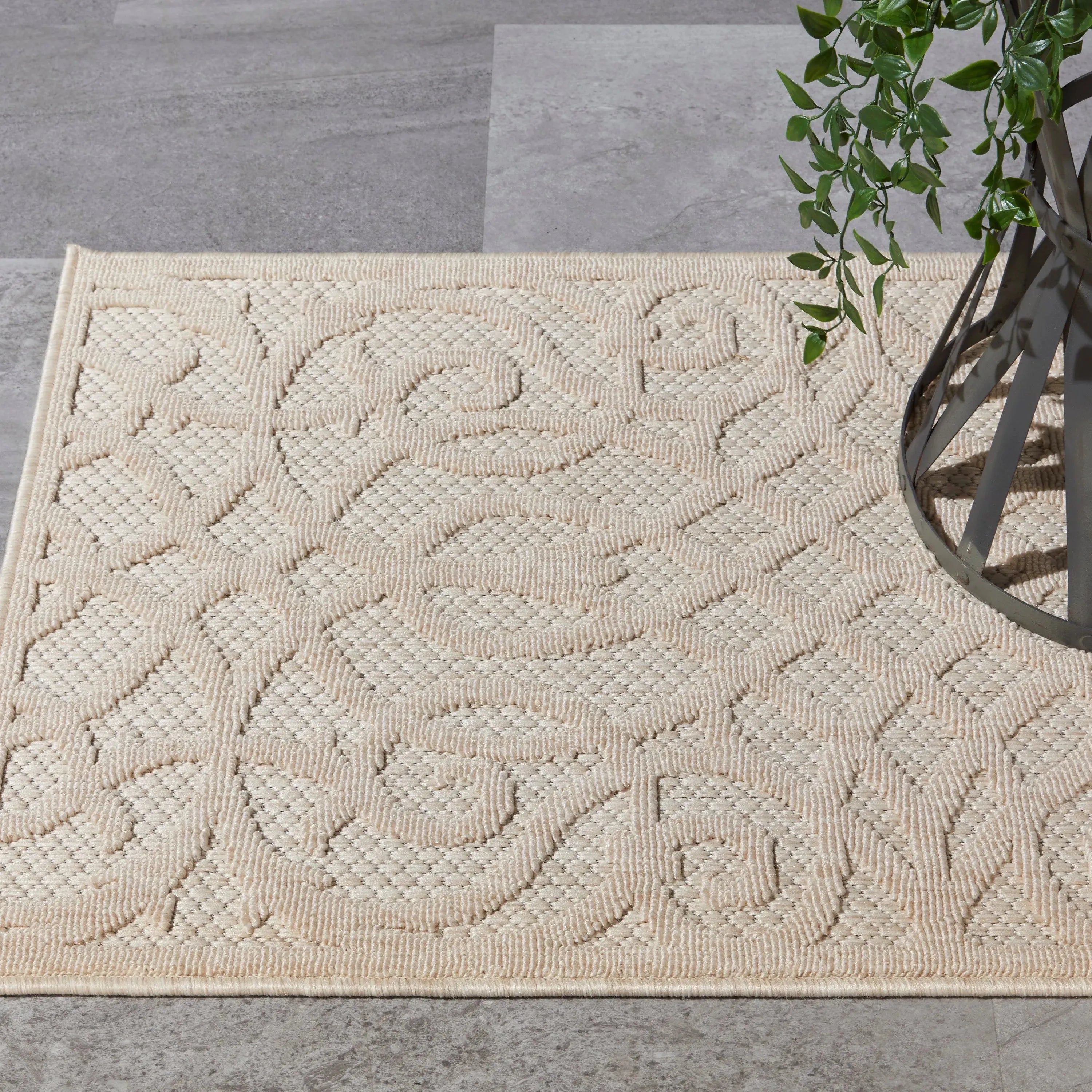 Can a rug sturdy enough for both indoor and outdoor use also be chic and attractive? For sure, if it's from the Cozumel Collection. These durable and fade-resistant area rugs are ideal for the casual lifestyle and work just as well in covered outdoor locations such as patio or porch as they do in your living room, family room or other favorite spot. Distinguished by their high-low loop pile, Cozumel area rugs take a visual cue from hand-carved rugs but are easily affordable and designed to withstand wear. This contemporary collection ranges from linear and geometric to sprightly florals and all enhanced by dimensional pile in today's most coveted neutral tones. Decorating is easy (and fun!) with the casual chic of textural Cozumel, power-loomed in modern poly-fibers.