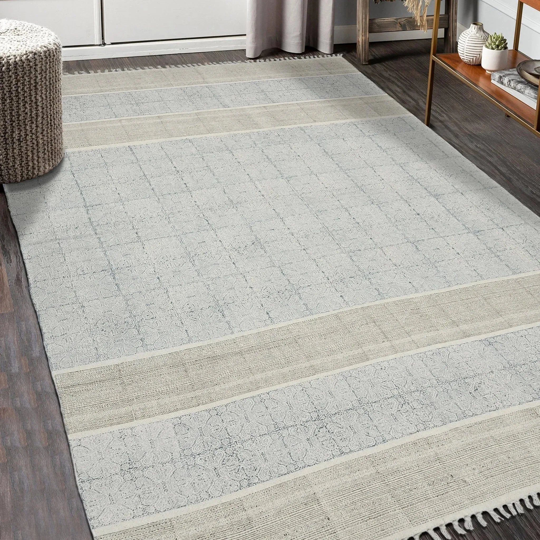 The Dune collection offers hand-woven, natural cotton rugs in a relaxed yet refined pattern. Featuring a low profile, subtle texture, and distressed geometric patterns, this collection will elevate your casual and cozy space to new heights. Looks and feels great in living rooms and bedrooms alike, with matching runners available. Handmade in India with all-natural, eco-friendly cotton featuring 1-inch braided tassels and a screen printed pattern with unbelievable softness and versatility.