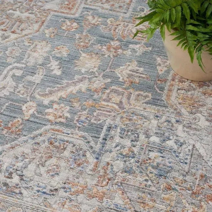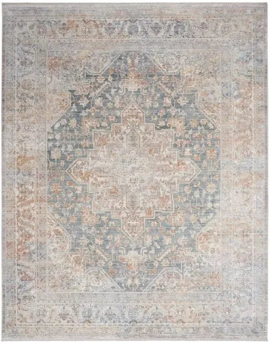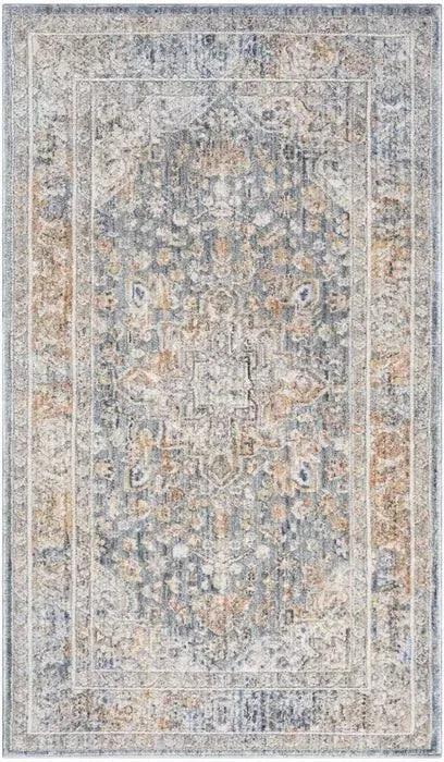 The Parisa PSA06 Denim/Multi Rug comes in various sizes, including 2x10, 5x7, 8x10, 8x11, 9x13, and 12x15 feet, accommodating different room dimensions.