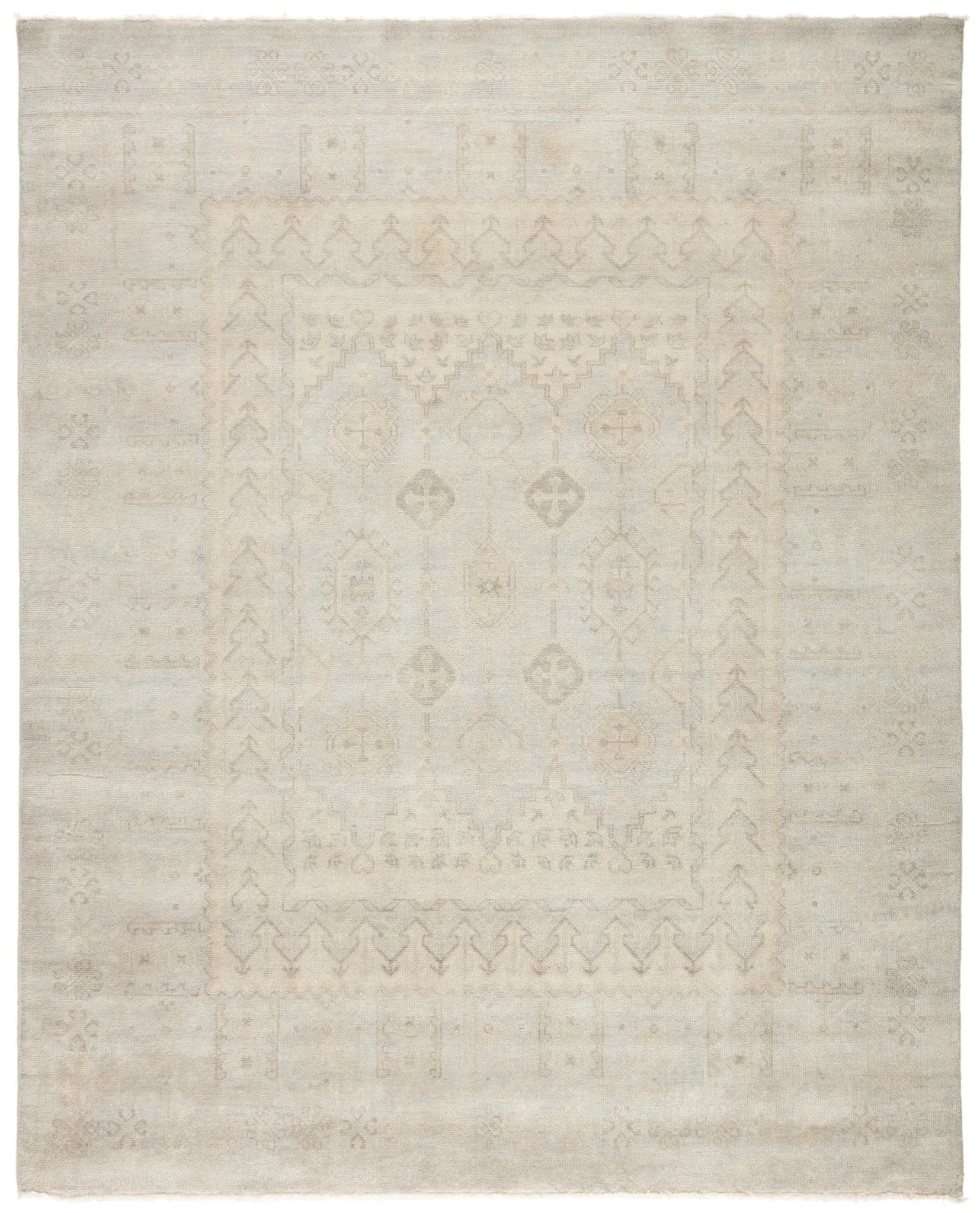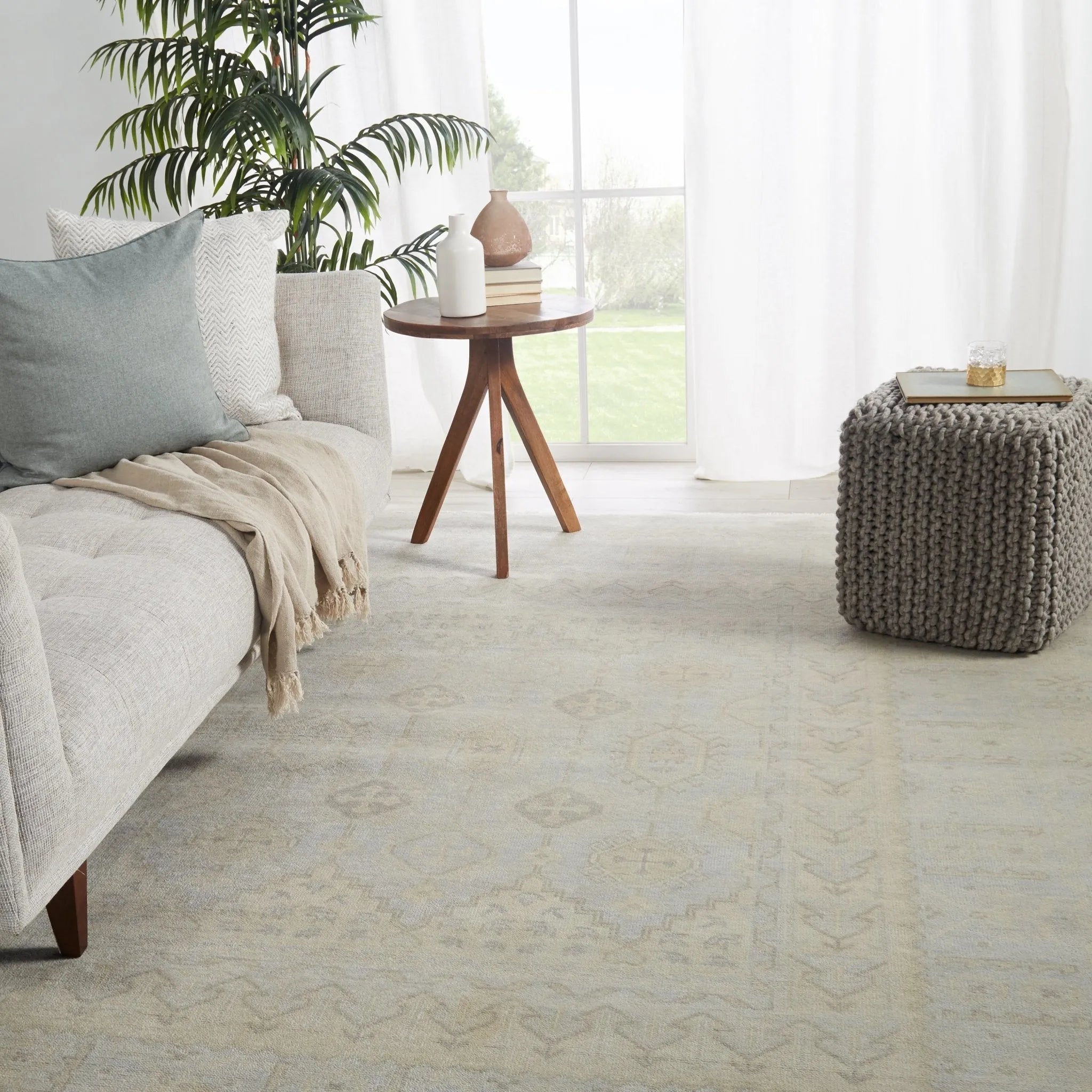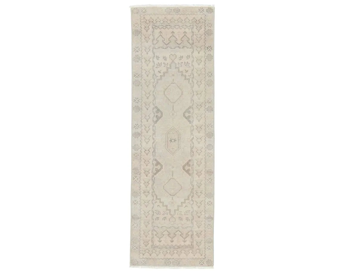 The Eloquent collection emanates traditional elegance, lending a soft and serene look to transitional homes. The Chival area rug features a washed vintage-inspired design in muted gray and beige tones. This hand-knotted wool rug grounds living spaces with a classic, stately look.
