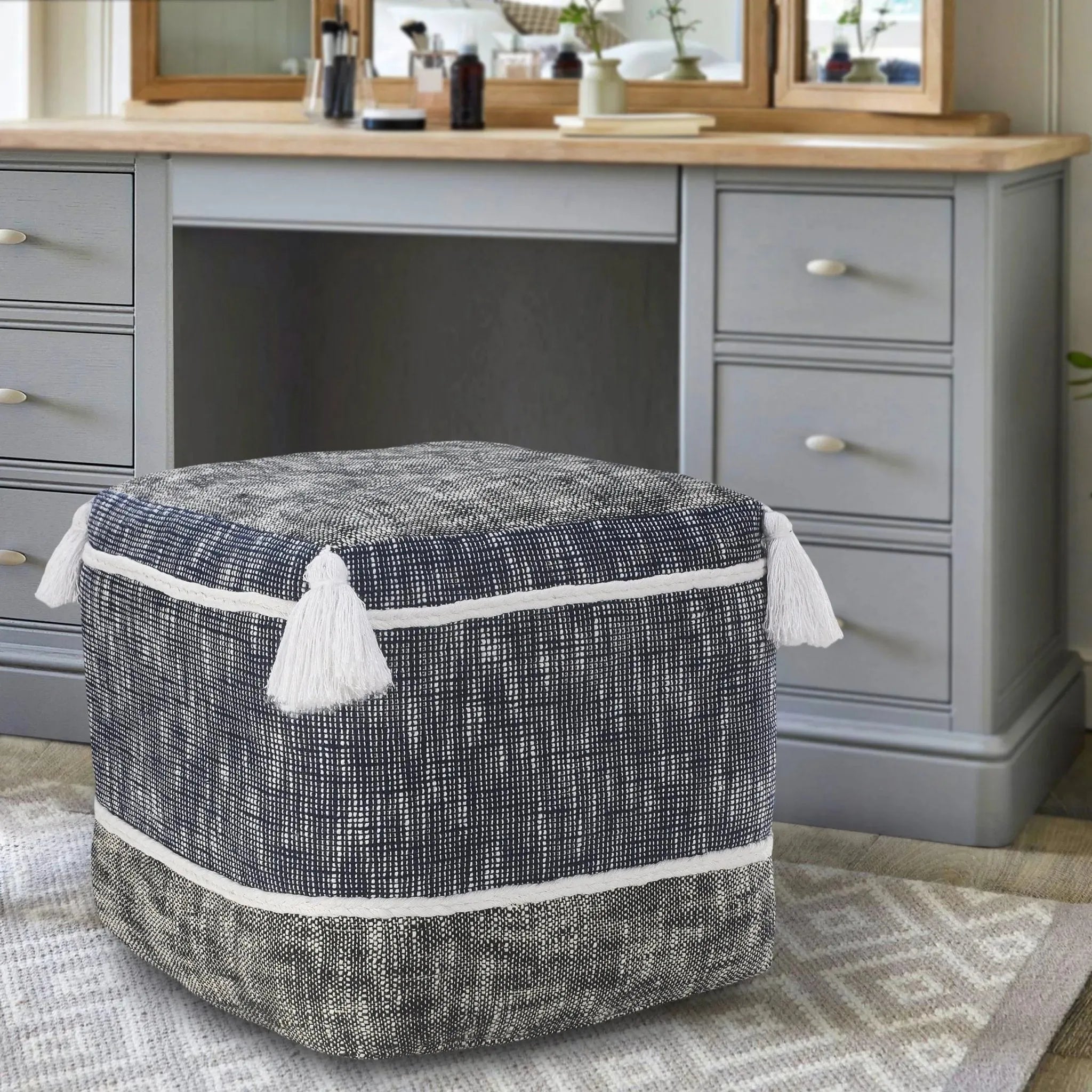 Our pouf seating collection is made to bring versatility into your space without sacrificing style. Use this piece as an extra seat, ottoman, footrest, or even a side table in smaller spaces for functional design. Featuring a distressed design with rope and tassels, this pouf is a perfect accent for your modern space. Bring this piece home today for a practical and fashionable addition!