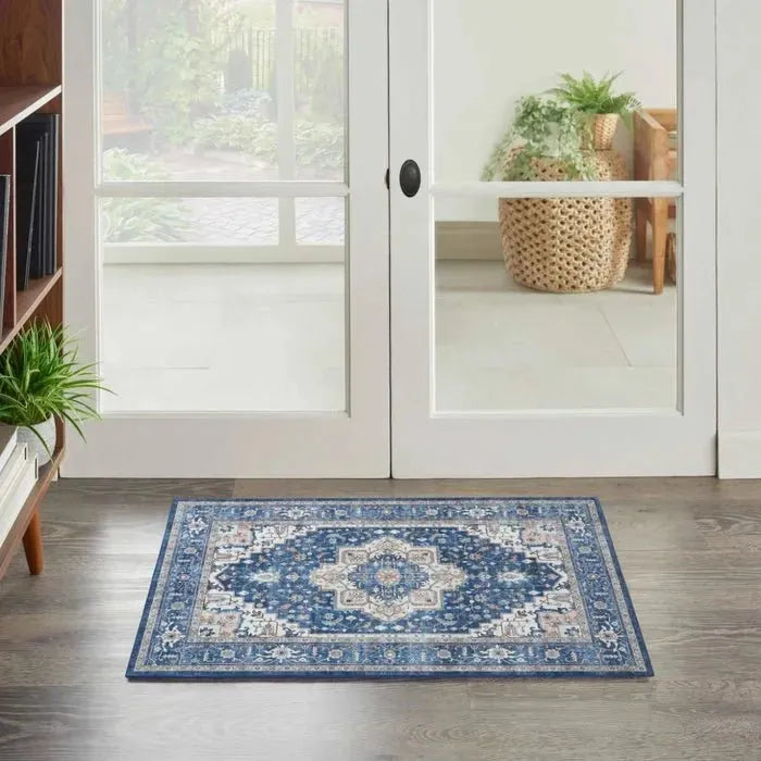 The Parisa PSA06 Denim/Multi Rug comes in various sizes, including 2x10, 5x7, 8x10, 8x11, 9x13, and 12x15 feet, accommodating different room dimensions.