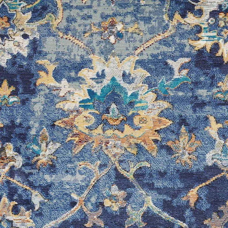 Featuring a delicately distressed Jacobean pattern, this deliciously soft area rug is sure to please. Botanical swirls in peach, yellow, and cream dance upon a background of blue in this striking design. Manufactured of polypropylene on a cotton backing, this piece is durable, wrinkle resistant, and feels soft on bare feet.