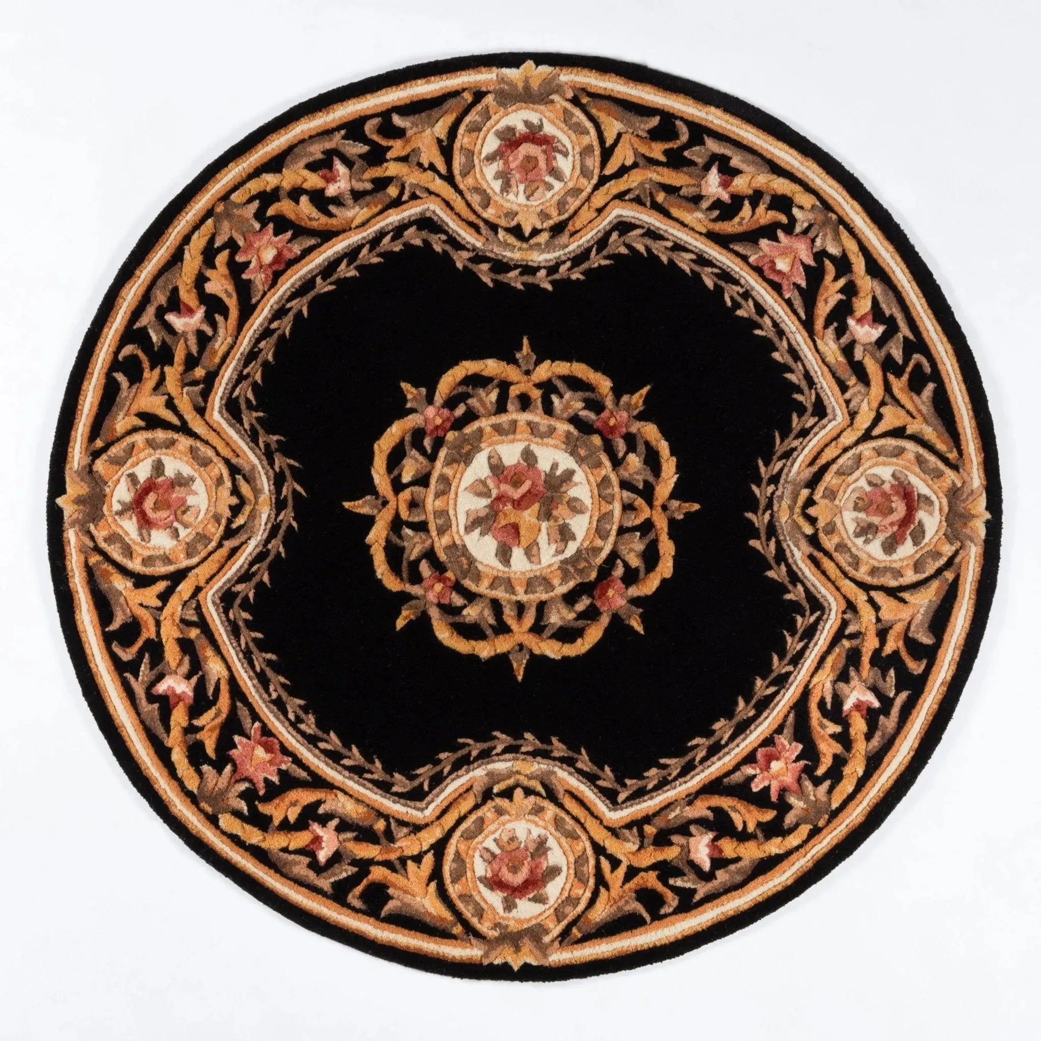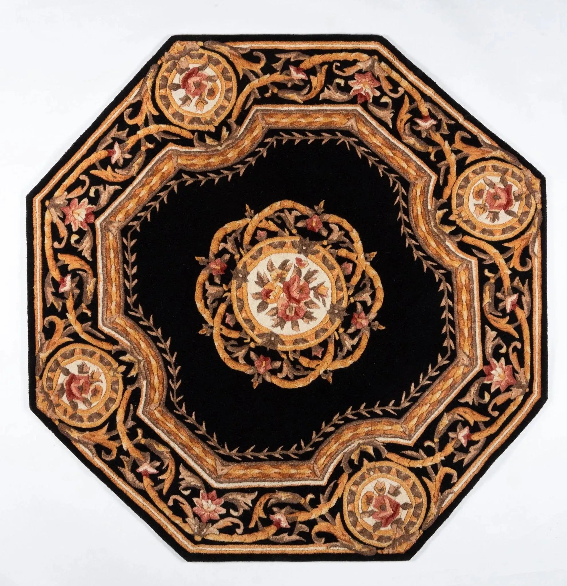 Hand tufted from 100% natural wool fibers, the curling vines and lush floral bouquets of the borders are hand carved for exquisite depth and dimension.