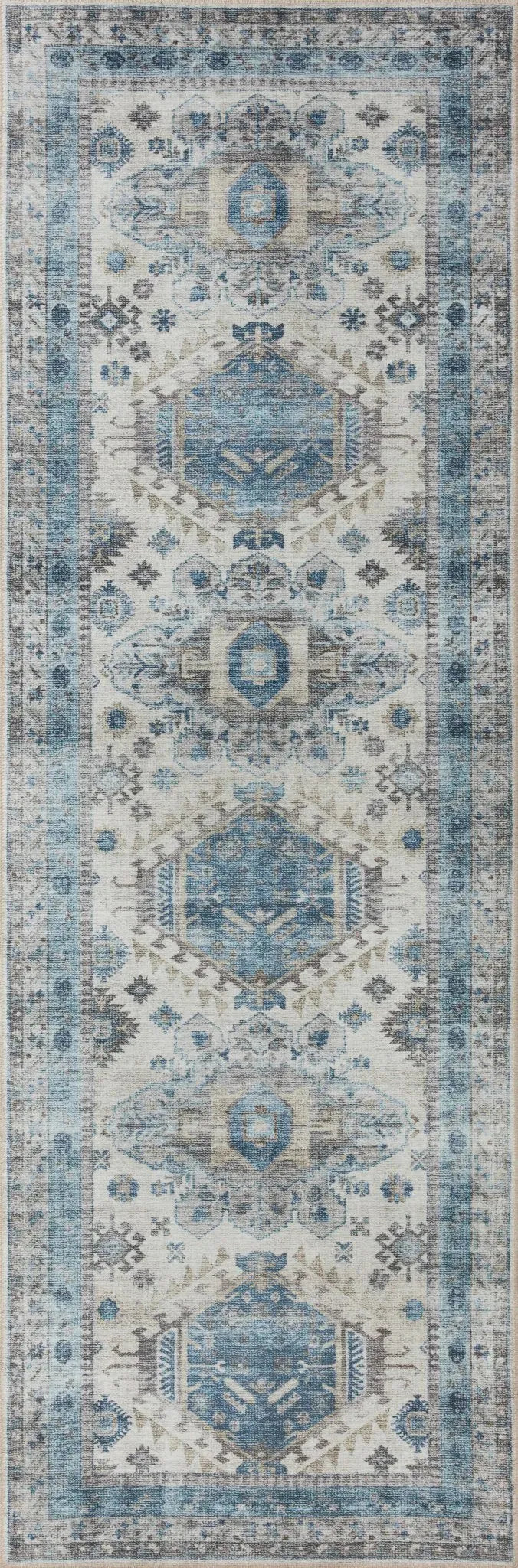 The Parisa PSA06 Denim/Multi Rug comes in various sizes, including 2x10, 5x7, 8x10, 8x11, 9x13, and 12x15 feet, accommodating different room dimensions.