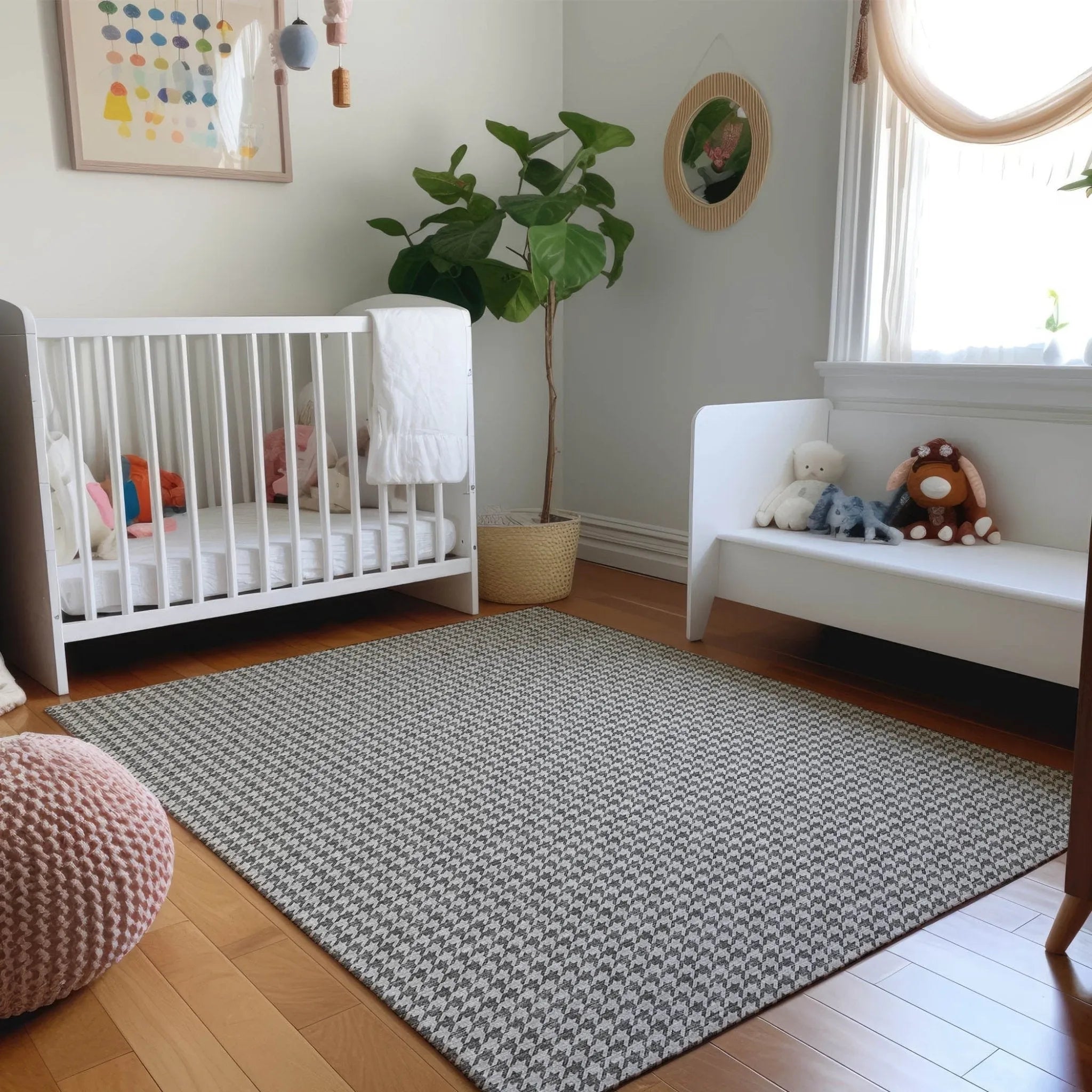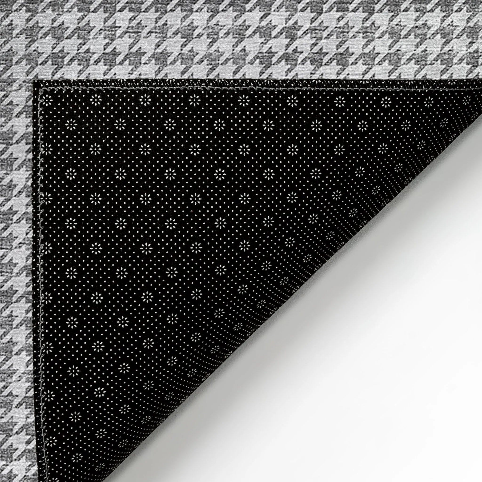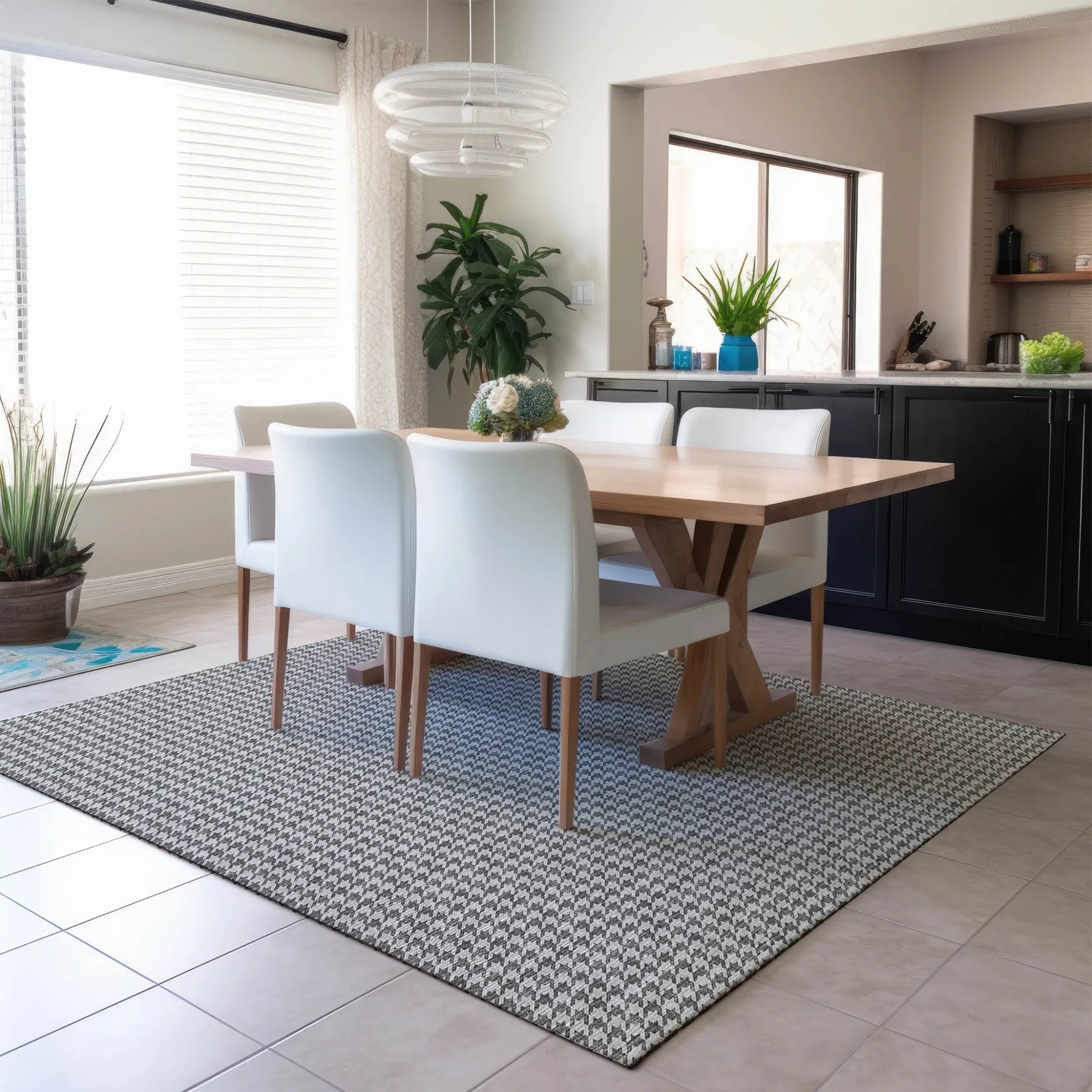 Experience the timeless elegance of houndstooth styling with our Hinton HN1 Grey Rug. Crafted in the USA using a blend of foreign and domestic materials, this rug combines classic design with modern durability for both indoor and covered outdoor use.