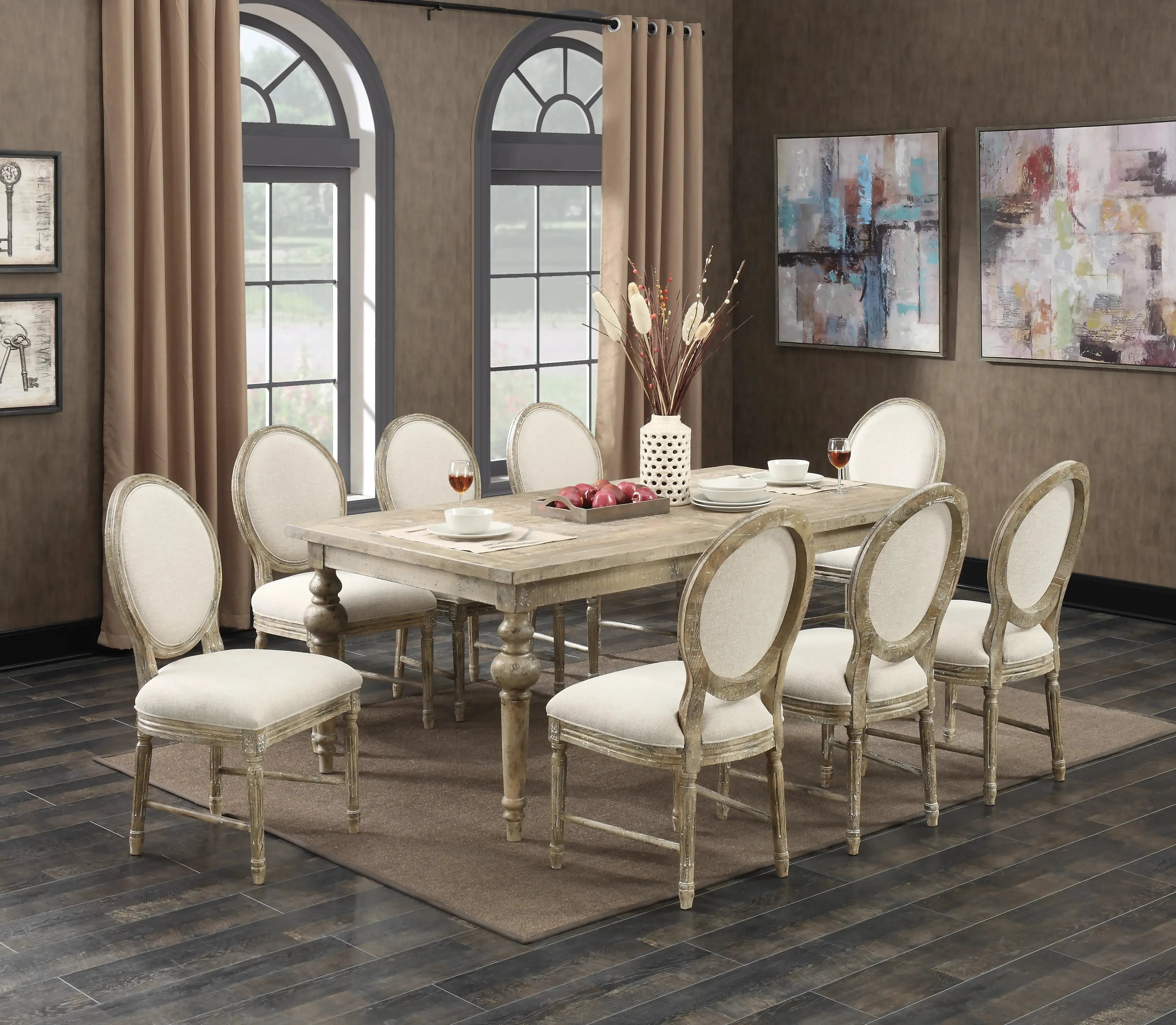 Interlude combines a rustic nature with classic portrait-back side chairs to create a French country look for today. Pine solids and veneers and American White Ash solids are brought together to craft the planked tabletops, turned legs, and fluted details. Cup pulls and exposed hand-latch rods add just the right touch of authenticity, while a soft whitewash settles in the heavily hand-distressed sandstone buff finish, adding texture to the contemporary French country collection.