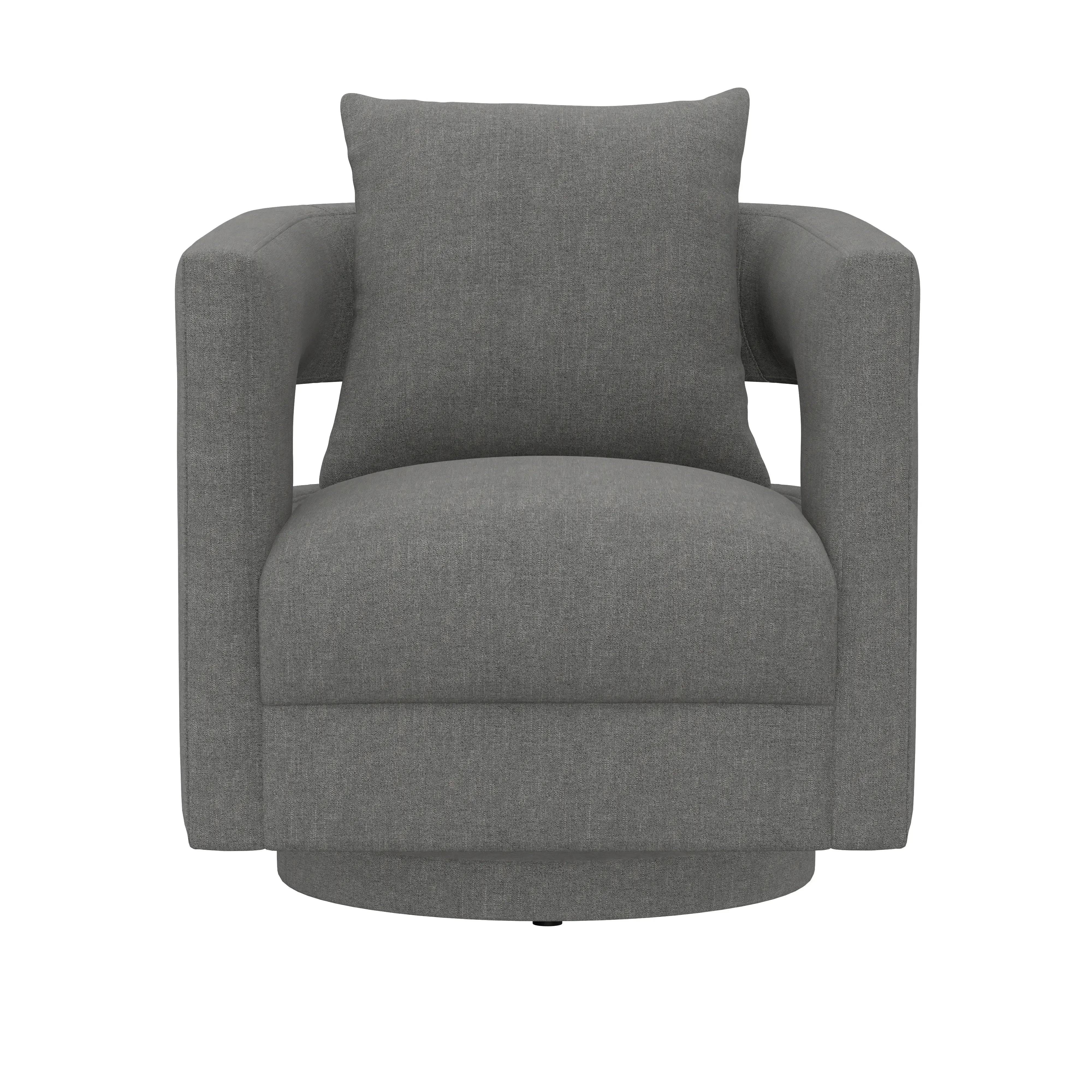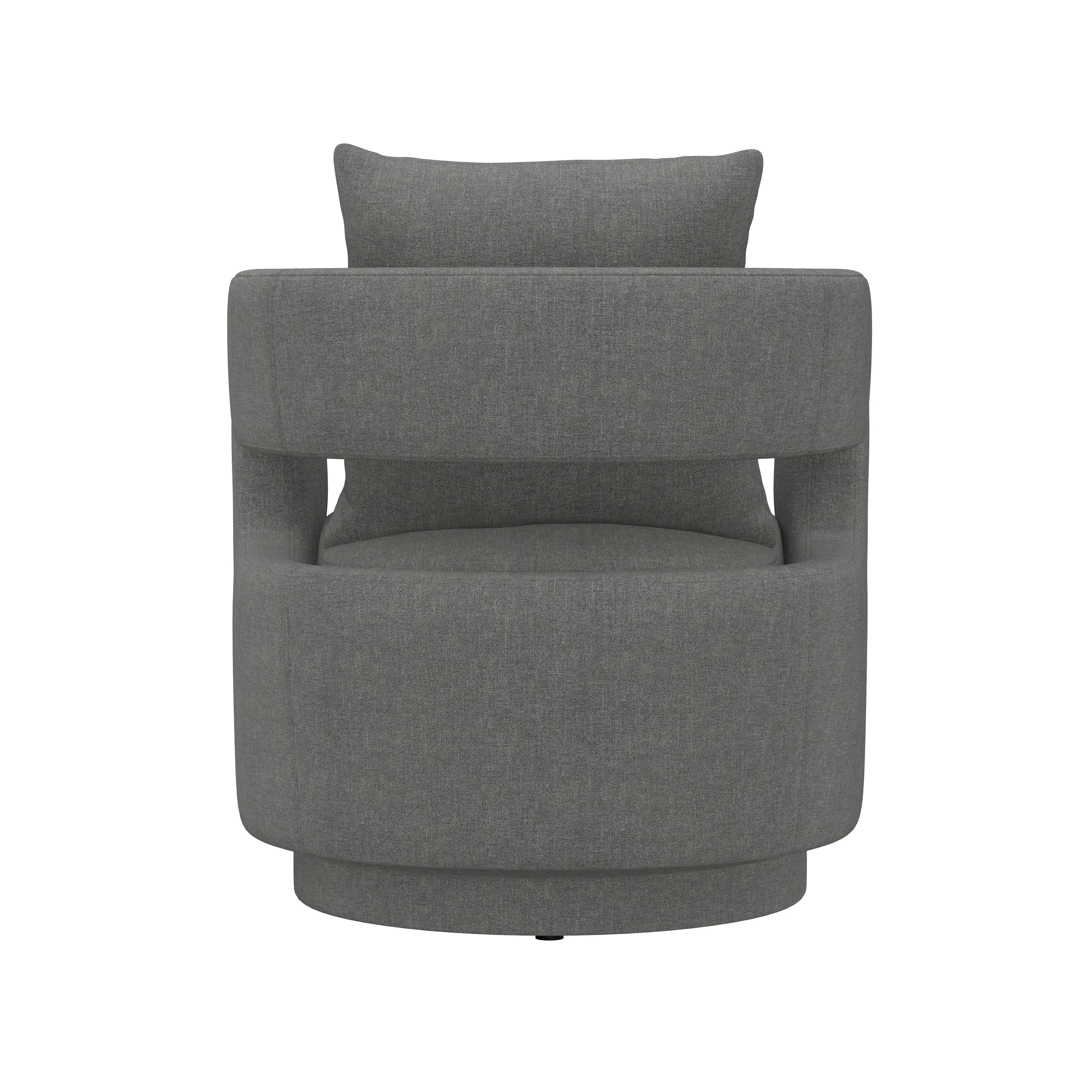 Jude takes the basic barrel chair and adds an open back cutout for an airy silhouette with modern flair. A removable back cushion builds in comfort—its square shape balancing the curved frame—while tight seams with no welting enhance the clean geometric shapes. Lightly textured upholstery in flint gray or dark khaki also wraps the 360-degree swivel base to blend into a cohesive look. If you’re feeling sad about your seating, let the Jude swivel chair into your life to make it better.