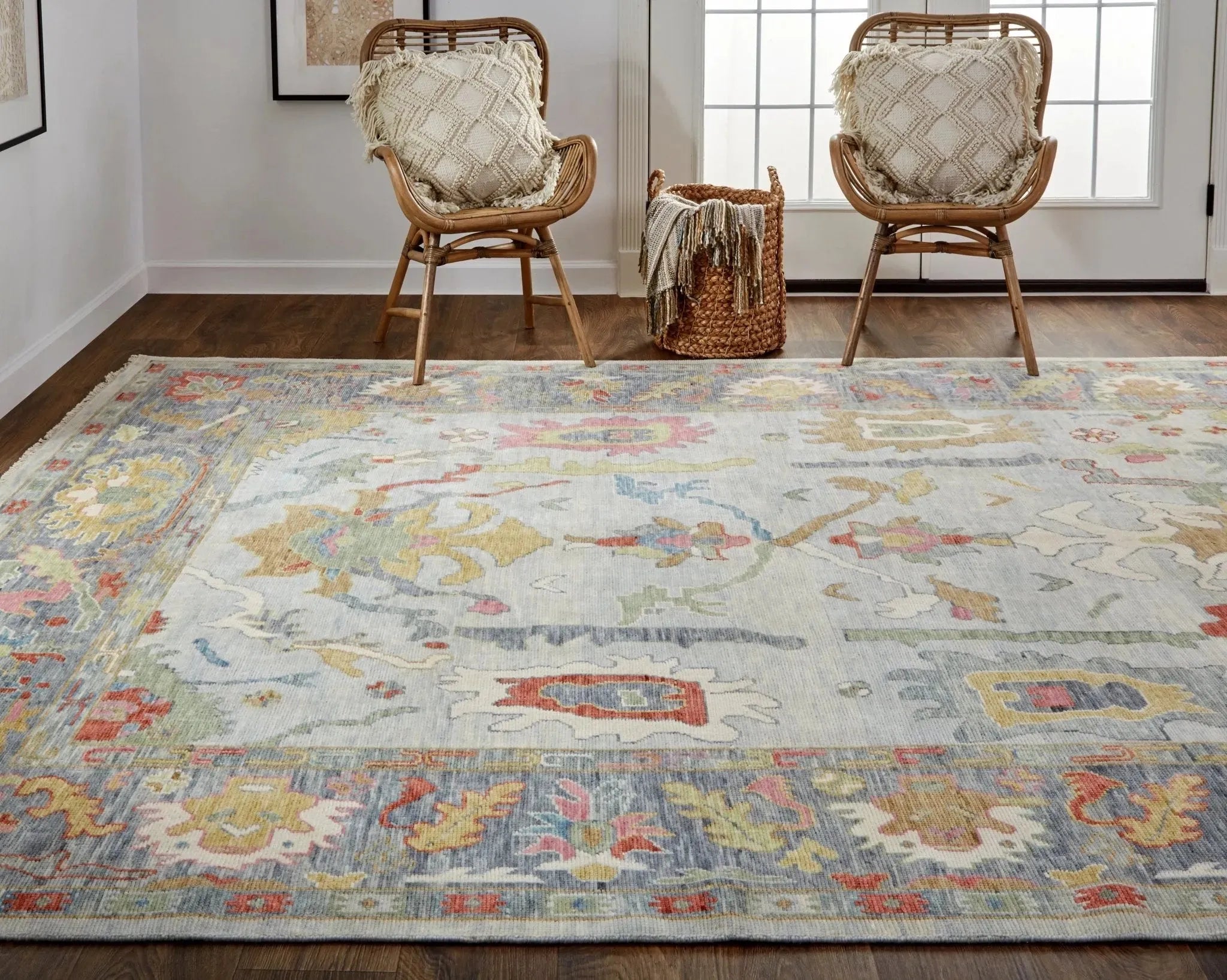 The Parisa PSA06 Denim/Multi Rug comes in various sizes, including 2x10, 5x7, 8x10, 8x11, 9x13, and 12x15 feet, accommodating different room dimensions.