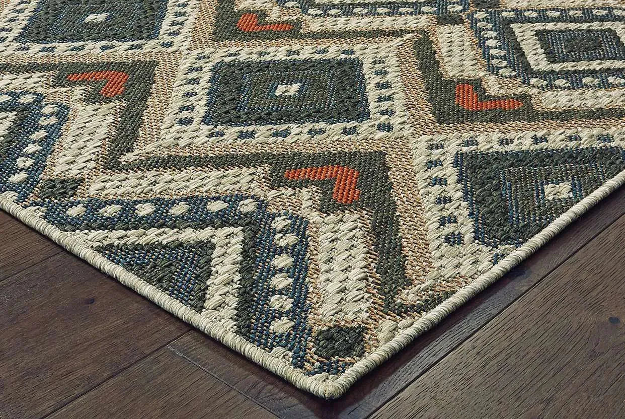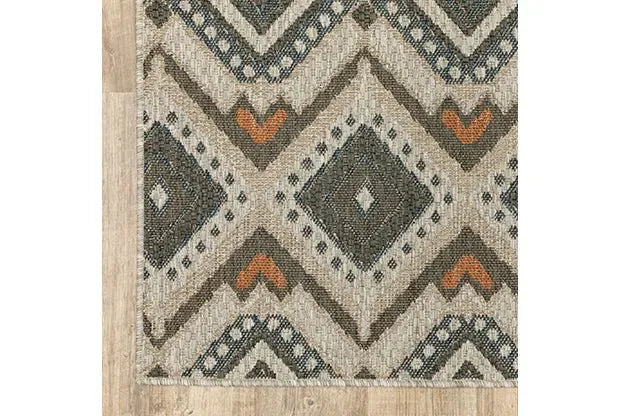 The Latitude collection showcases sophisticated designs ranging from traditional tile and medallion patterns to simple modern borders and geometrics. Multi-colored yarns in neutral grays, accented by tones of deep navy and vibrant persimmon, add texture and a pop of color underfoot. Machine-woven of polypropylene, Latitude is easy to care for and can be used both indoors and out.